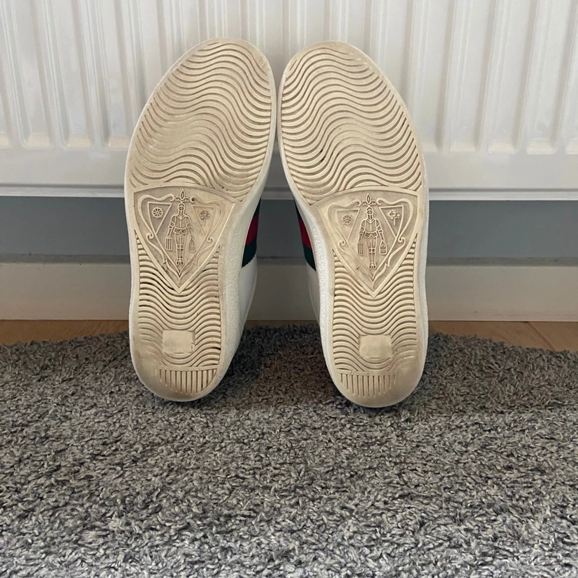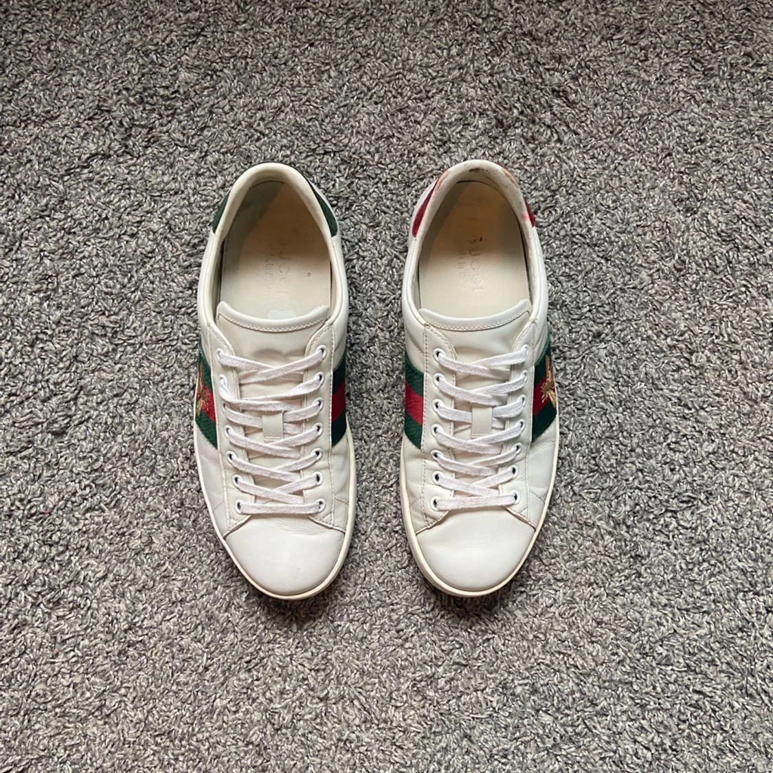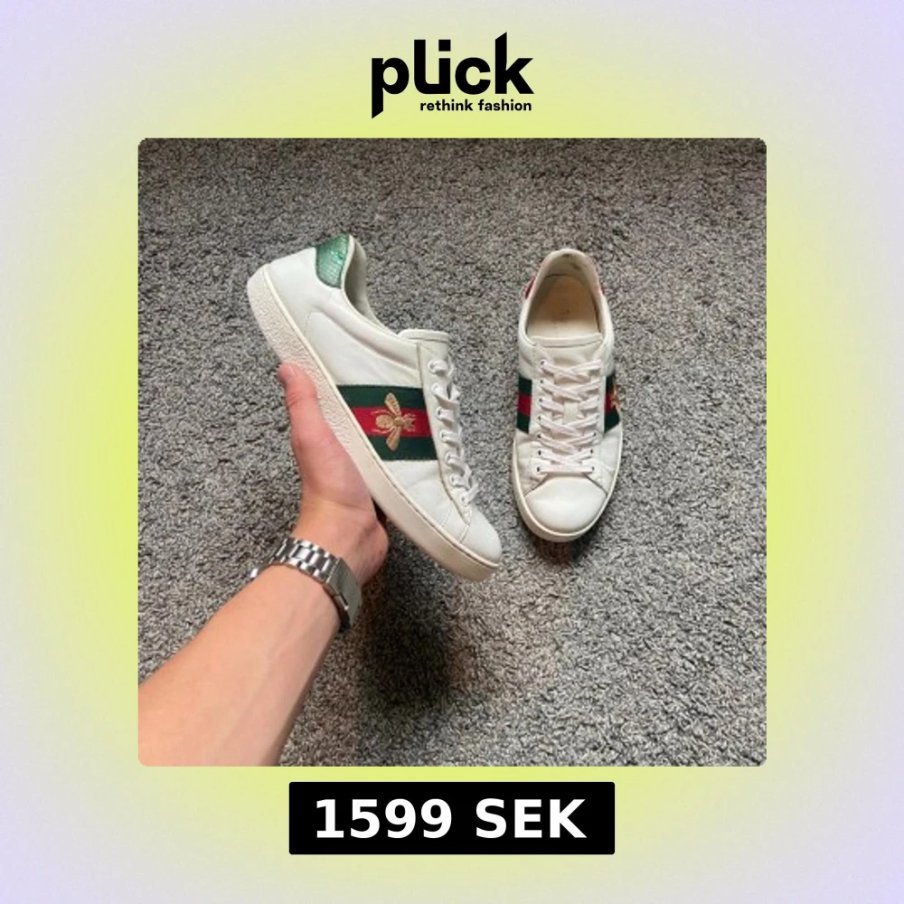 Gucci Ace sneakers i vitt skinn med klassiska gröna och röda ränder på sidorna och broderad guldfärgad bi. Grön och röd detalj i metallic på hälen. Platt sula och snörning framtill. Snygg och ikonisk modell för dig som gillar lyxiga detaljer.