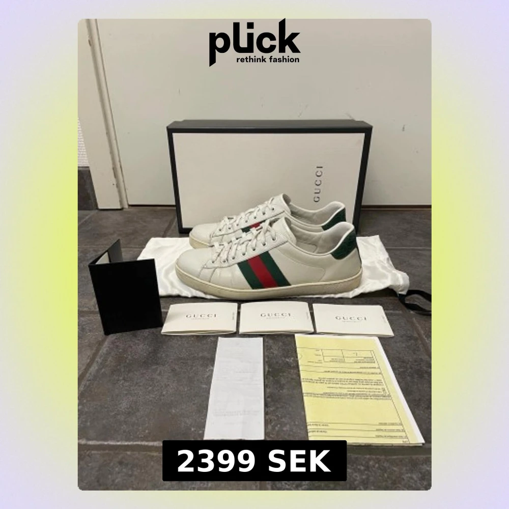 Säljer dessa feta Gucci Ace skor. En liten defekt vid högra hälen (se bild 6), snörerna är även lite smutsiga annars Bra skick. Storlek 8,5 US motsvarar 42,5 ungefär. Allt og medkommer samt äkthetscertifikat och kvitto. Pris kan självklart diskuteras!!