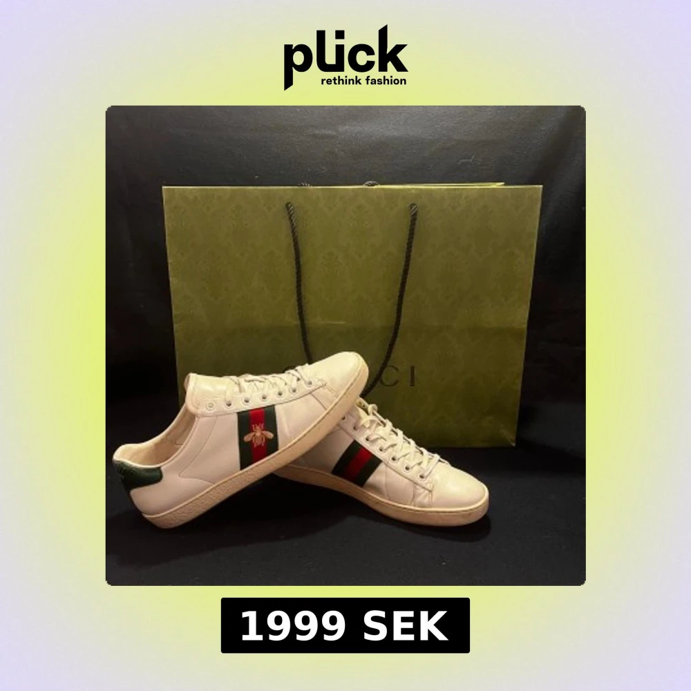 Säljer ett par stilrena Gucci sneakers i vitt skinn med klassiska gröna och röda ränder på sidan. De har en snygg broderad insekt och olika färger på hälen, en röd och en grön. Perfekta för att lyfta vilken outfit som helst! 🐝storlek 42 passar 42/43.