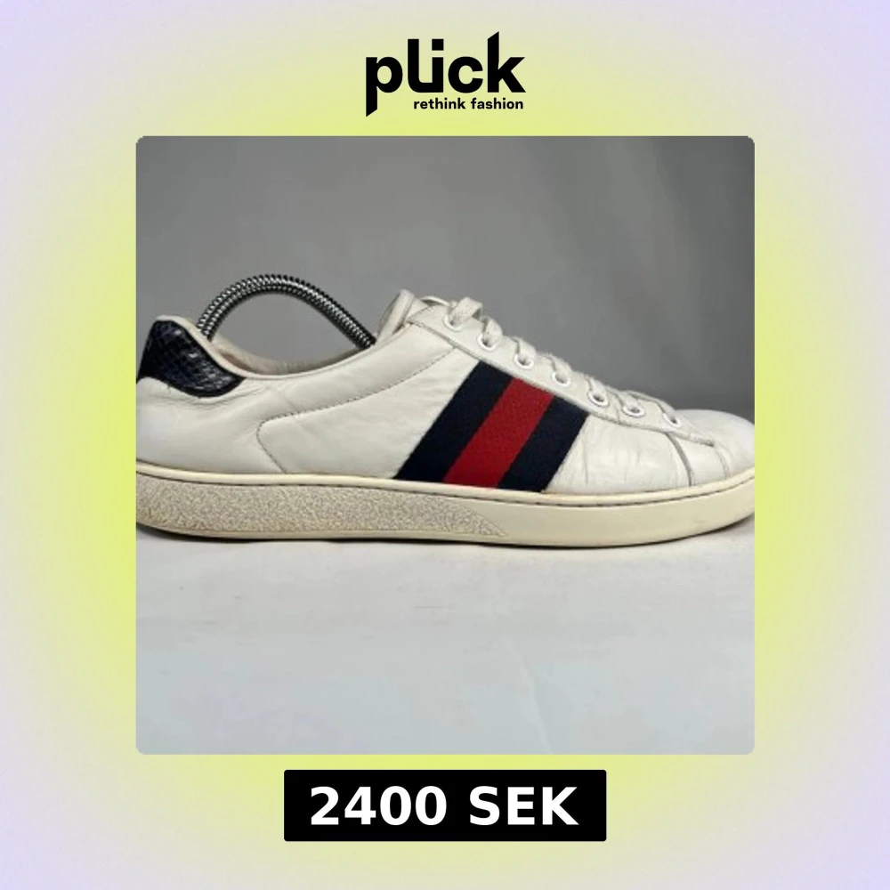 Snygga vita sneakers från Gucci i skinn med klassiska röd och marinblå ränder på sidan. Skon har rund tå, snörning och en detalj i svart ormskinnsmönster på hälen. Perfekt för dig som vill ha en clean men ändå lyxig look. 100% äkta. Pris pga ingen dust bag eller og box