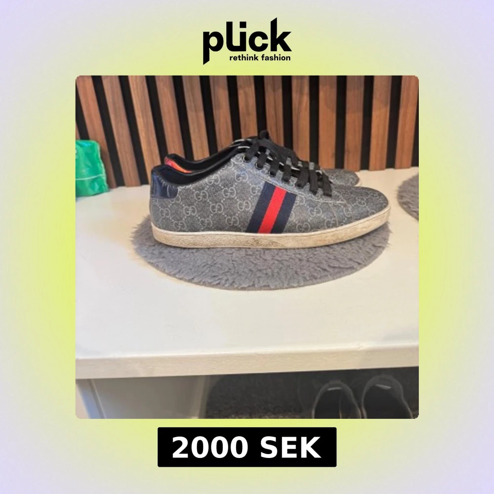 Snygga Gucci sneakers i grått med klassiskt GG-monogram över hela skon. Sidan har en fet röd och marinblå rand, och skorna har svarta snören. Yttermaterialet är canvas med detaljer i skinn. Rund tå och platt sula med Gucci-logga undertill. Kommer med originalkartong och påse. Tvättar innan jag skickar
