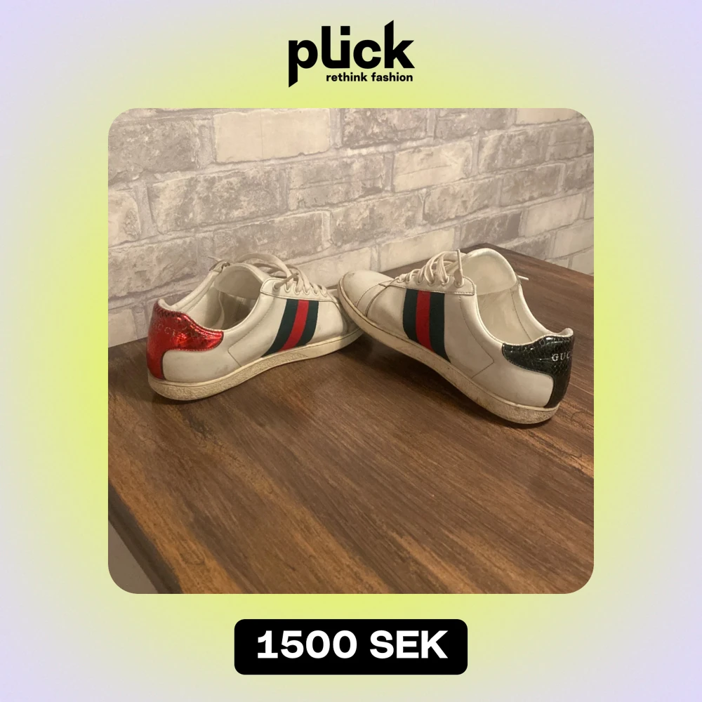 Säljer ett par vita Gucci-sneakers i skinn med ikoniska ränder i grönt och rött. Skorna har en cool ormmönsterdetalj på sidan och glittriga hälpartier i rött och grönt. Perfekta för att ge din outfit en lyxig touch! Använda men i bra skick.