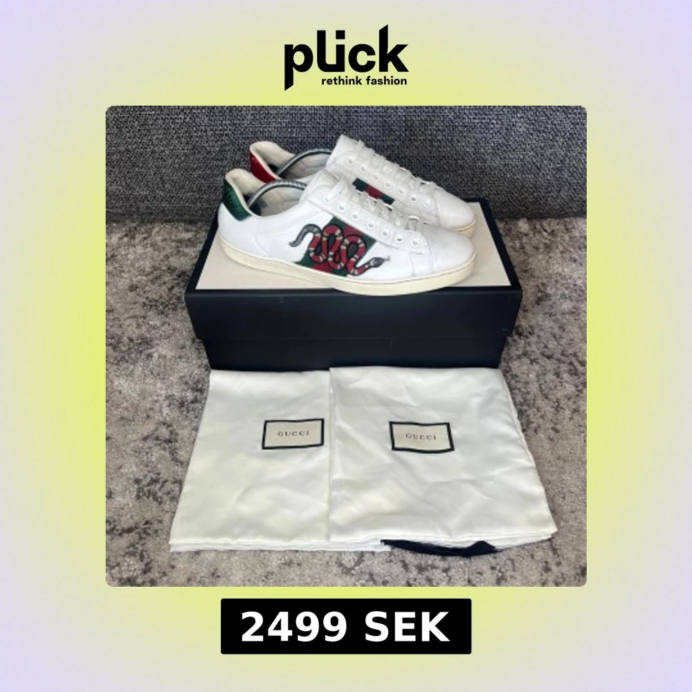 Gucci Ace skor!! | Säljer dessa supersnygga Gucci ace skor 💫 | Skorna är i strl 42/ UK 8, och modellen ”snake”| Skorna är 8,7/10 skick och sparsamt använda 🌟 | Har 1 liten defekt, en liten söm har gått upp vid ormen samt att boxen har lite smuts på sig (se bild 3) 🌟| Box och dustbags ingår | Nypris - ca 9000 sek | Pris kan diskuteras vid snabb affär!! 💸 | För flera bilder eller frågor så är det bara att kontakta mig, skriv gärna till mig innan ni köper!📩