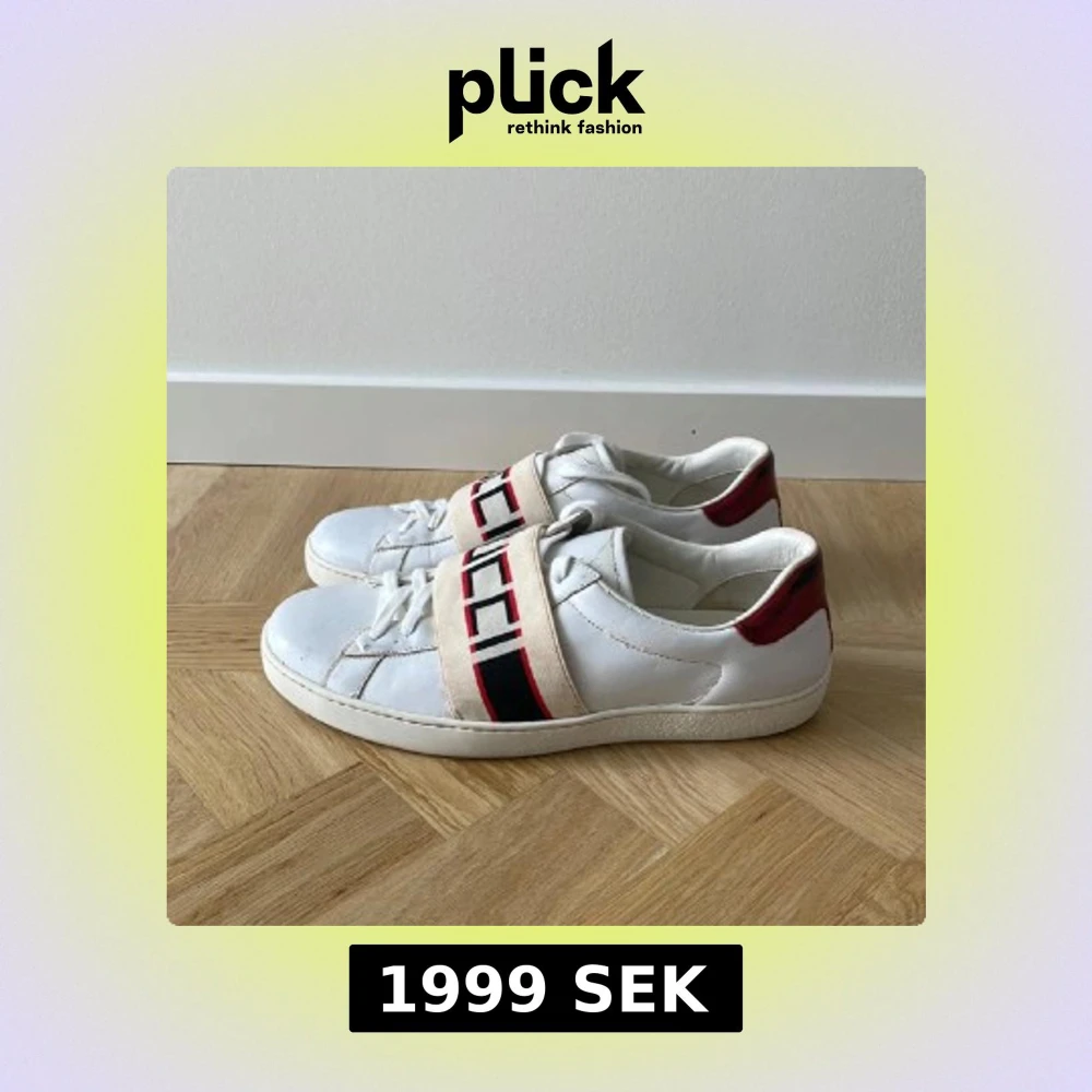 Snygga vita sneakers från Gucci med breda elastiska band över foten med logga i svart och rött. Skorna har röda metallic-detaljer på hälen och klassisk rund tå. Tillverkade i skinn med vit platt sula och snörning framtill. Perfekta för dig som gillar statement sneakers.