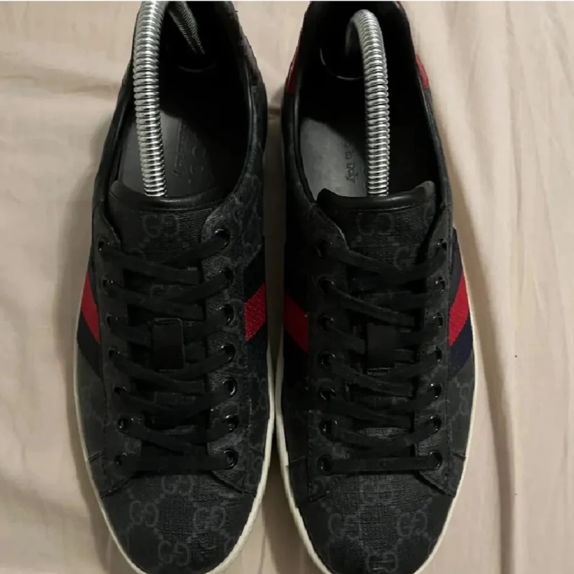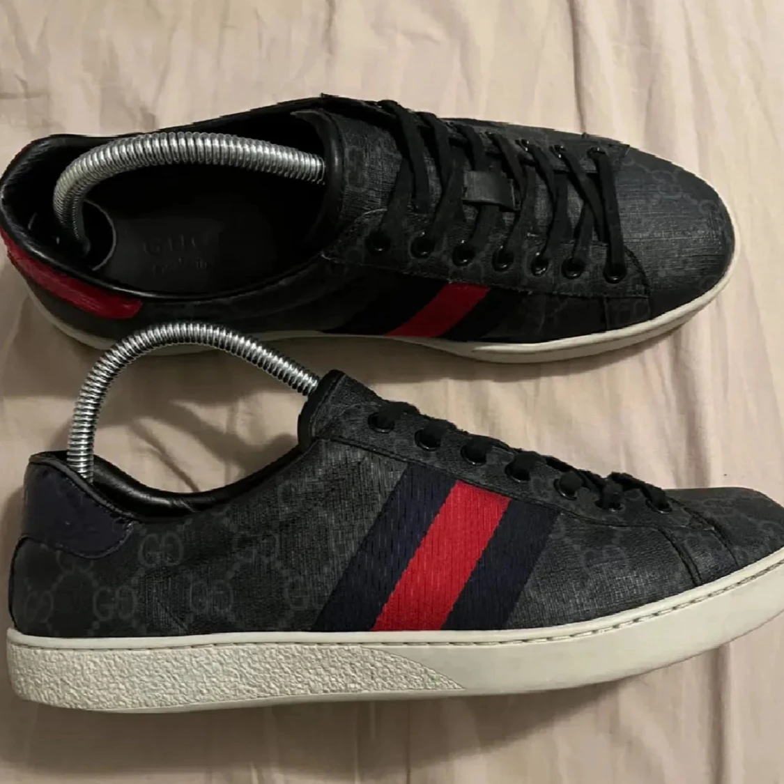 Snygga svarta Gucci sneakers med klassiskt GG-mönster och ikoniska röda och marinblå ränder på sidorna. Skorna har svarta snören, vit platt sula och detaljer i skinn. Perfekta för dig som vill sticka ut med en lyxig streetstyle.