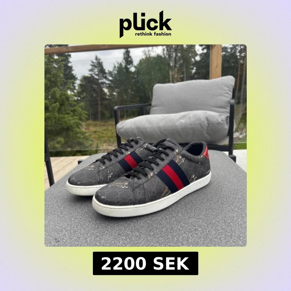 Säljer ett par Gucci sneakers i mörkgrått med klassiskt GG-mönster, röda och blå ränder på sidorna samt olika färg på hälen – en röd och en blå. Skorna har vit platt sula och svarta skosnören. Perfekt för dig som vill sticka ut med lyxig stil. Inga defekter och nypris ligger på 9000. Priset är inte hugget i sten så hör av dig!!😆