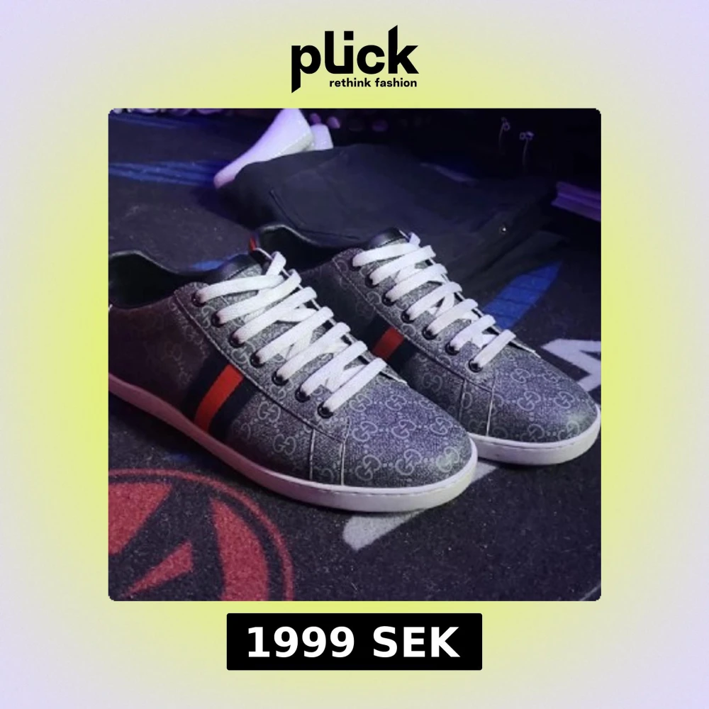 Snygga Gucci sneakers i grått med klassiskt GG-mönster, vita snören och röd-svart rand på sidan. Baksidan har metallicdetaljer i rött och svart med Gucci-logga. Yttermaterial i canvas och detaljer i skinn. Perfekta för dig som vill sticka ut med lyxig streetstyle.