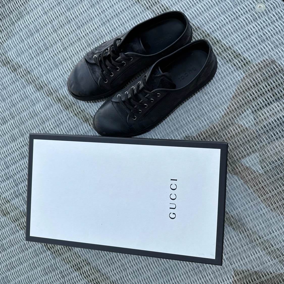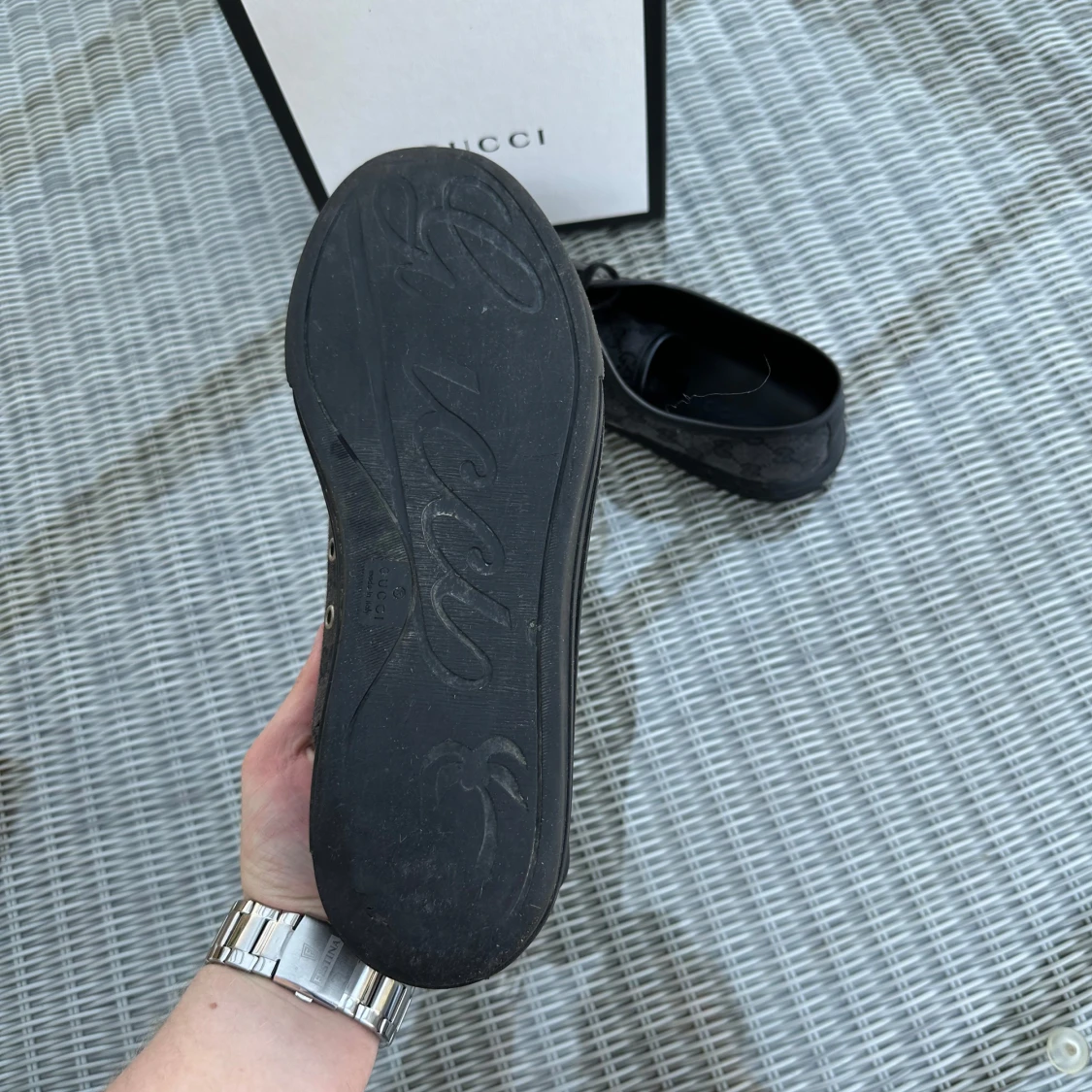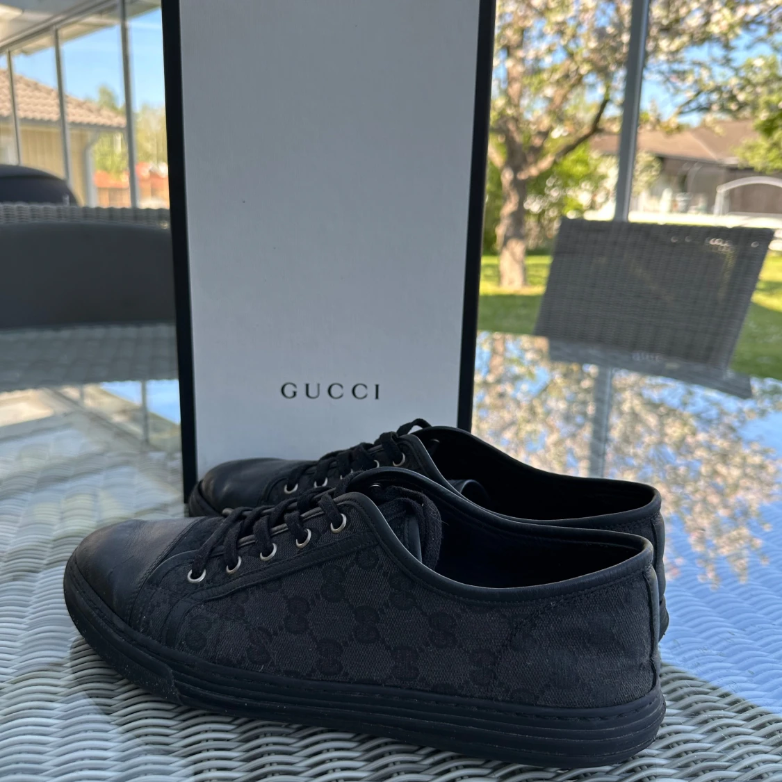 Säljer ett par svarta sneakers från Gucci med diskret GG-mönster på sidan och svarta snören. Skorna har rund tå och platt sula med Gucci-logga undertill. Perfekta för dig som gillar stilrena och exklusiva sneakers.