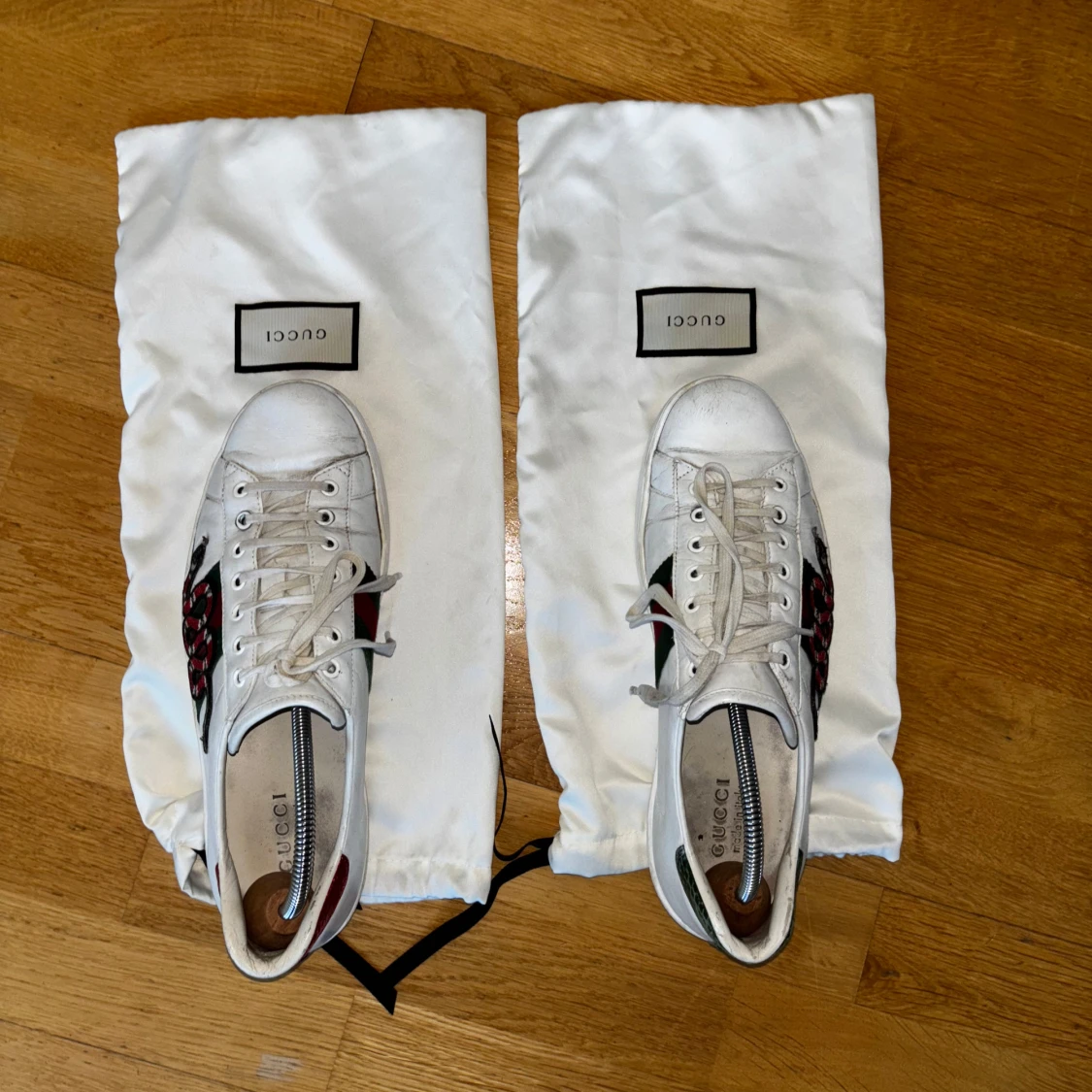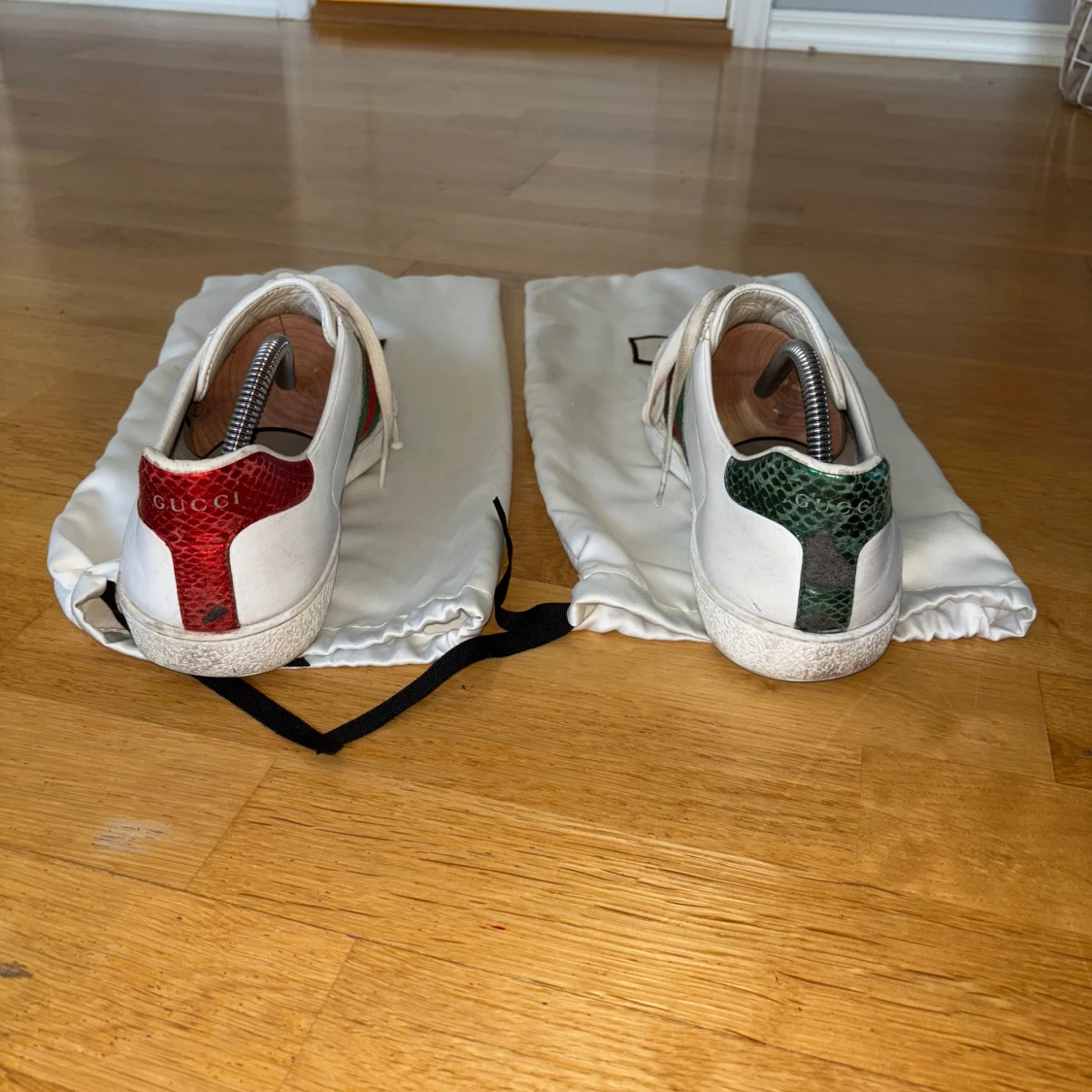Säljer ett par vita Gucci Ace sneakers med ikonisk röd och grön orm-brodyr på sidan. Skorna har gröna och röda detaljer på hälen och klassisk snörning. Kommer med original dustbags. Bra skick, det ända som har lossnat lite är de röd/gröna detaljerna bak. Därav lite lägre pris, annars fina och i bra skick!😊