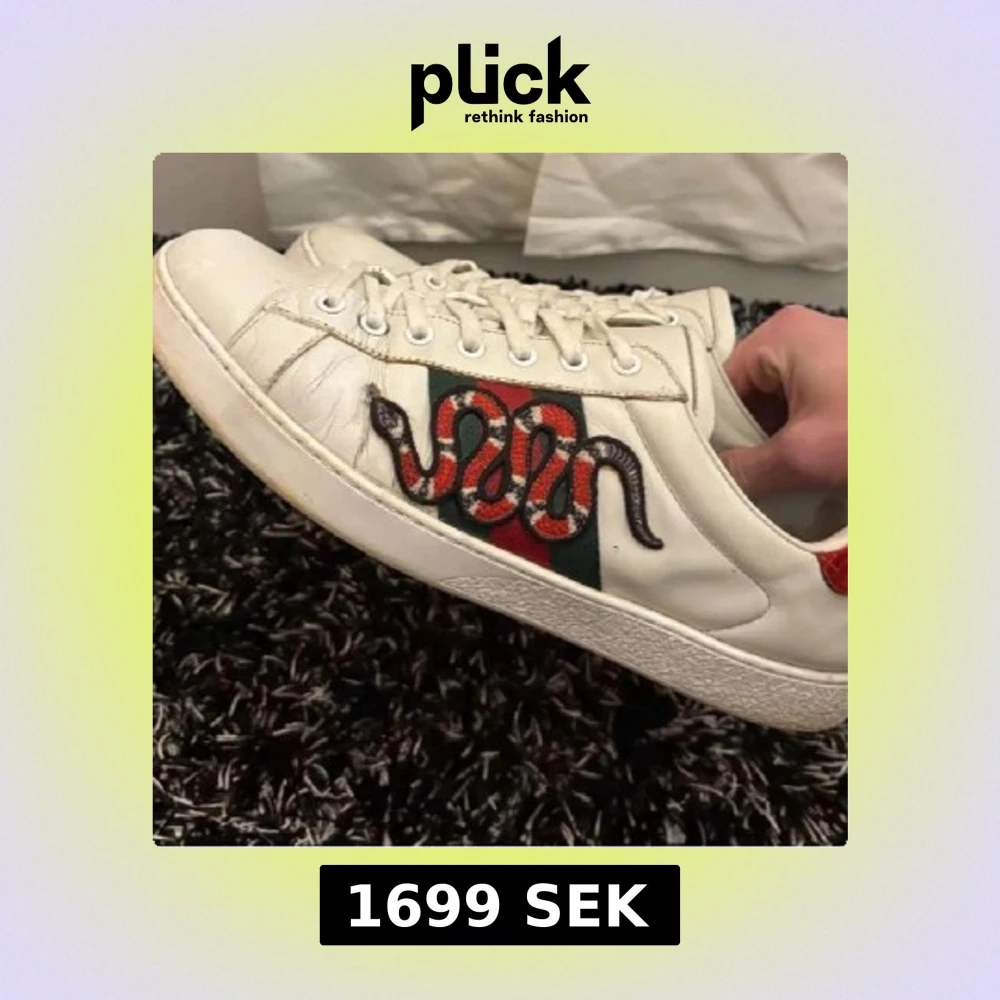 Säljer ett par vita Gucci ace, dem är i ett bra skick och använt några gånger. Säljer de för jag inte använder dem längre och köpt nya skor, dem är väldigt fräscha. Nypris 9000kr säljer för 1699 så ett väldigt bra pris kom med bud!