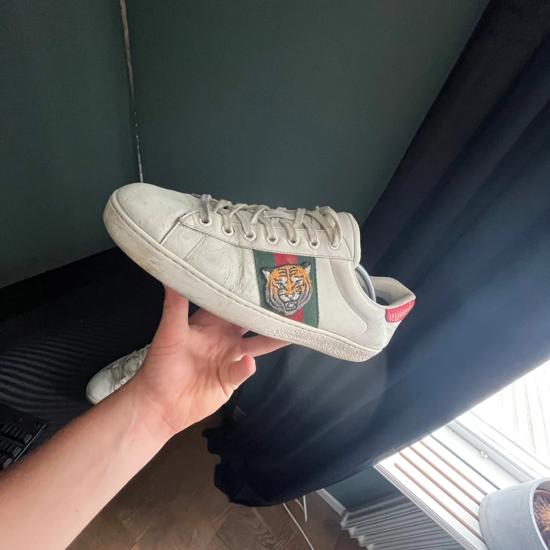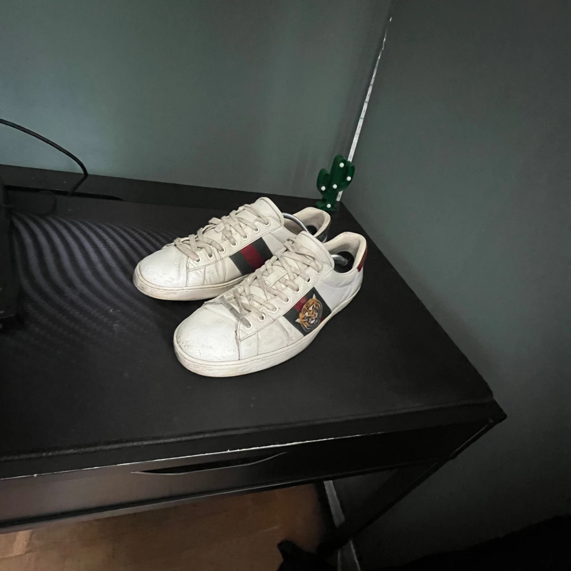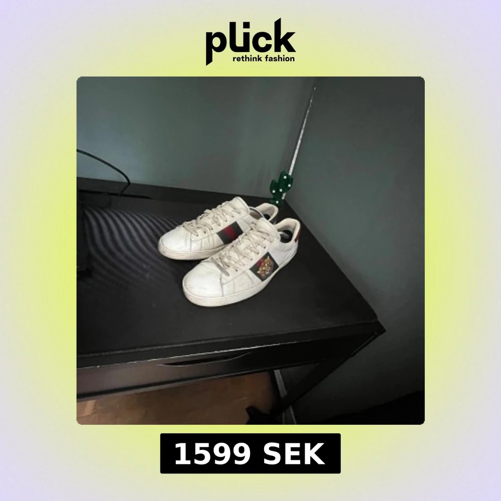 Säljer nu ett par riktigt snygga Gucci ace skor, perfekta skor till dig som vill ha några stilrena skor riktigt feta och passar till det mesta, defekter förekommer som syns på bilderna och man bedömer skicket själv efter bilderna! Inget og medföljer! skulle själv säga att dom är i hyfsat bra skick och mycket kvar att ge skriv vid minsta fundering💫