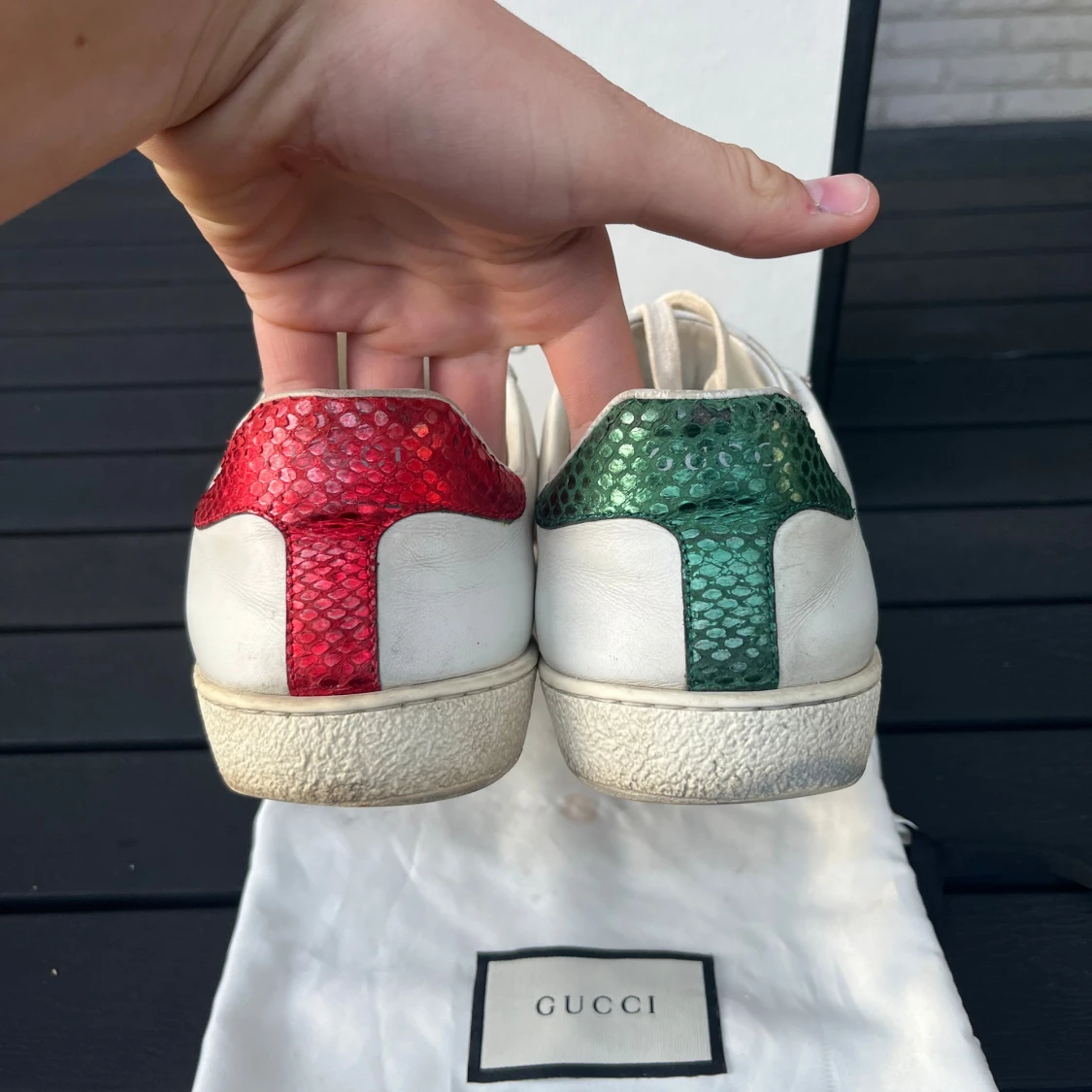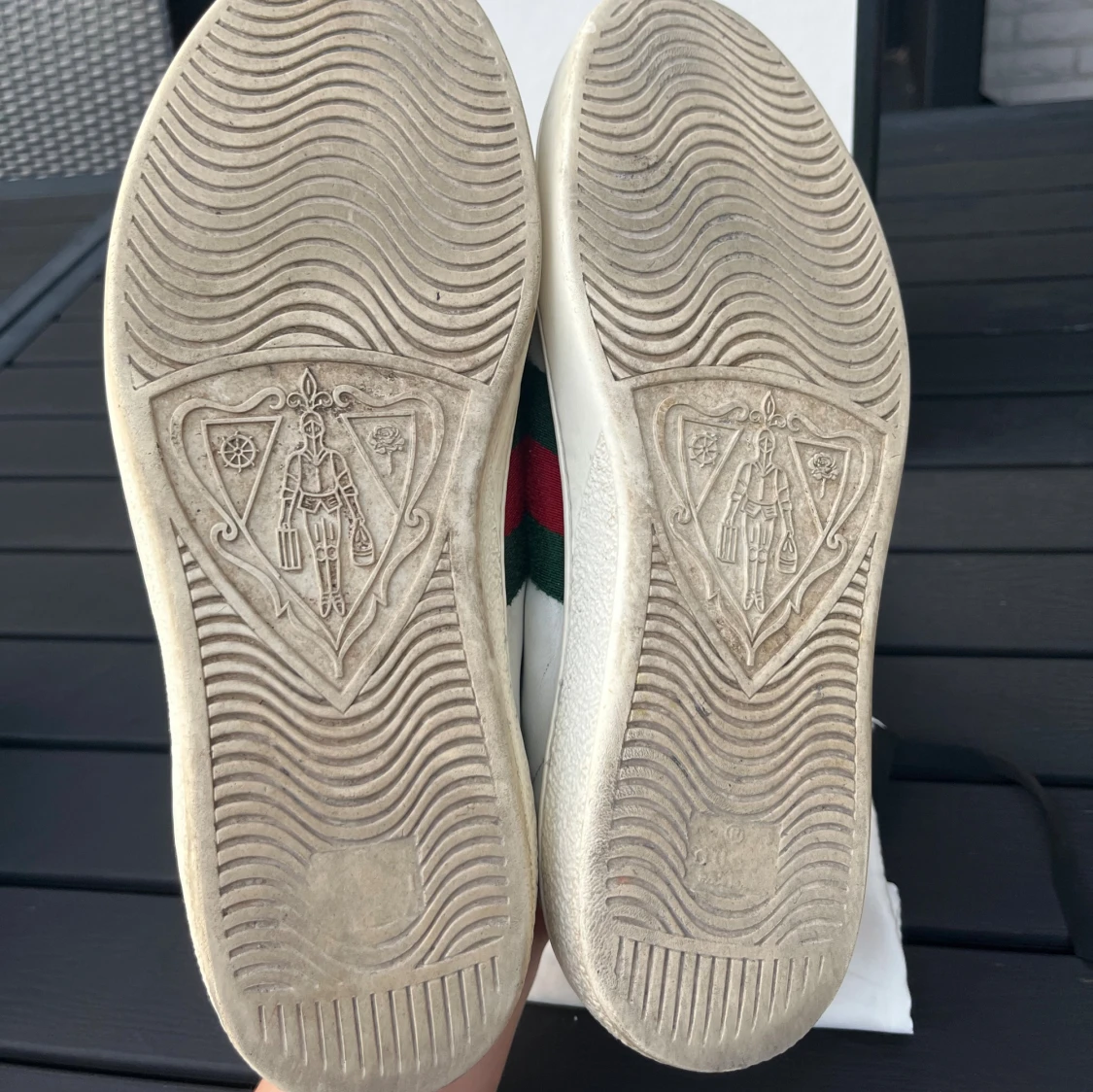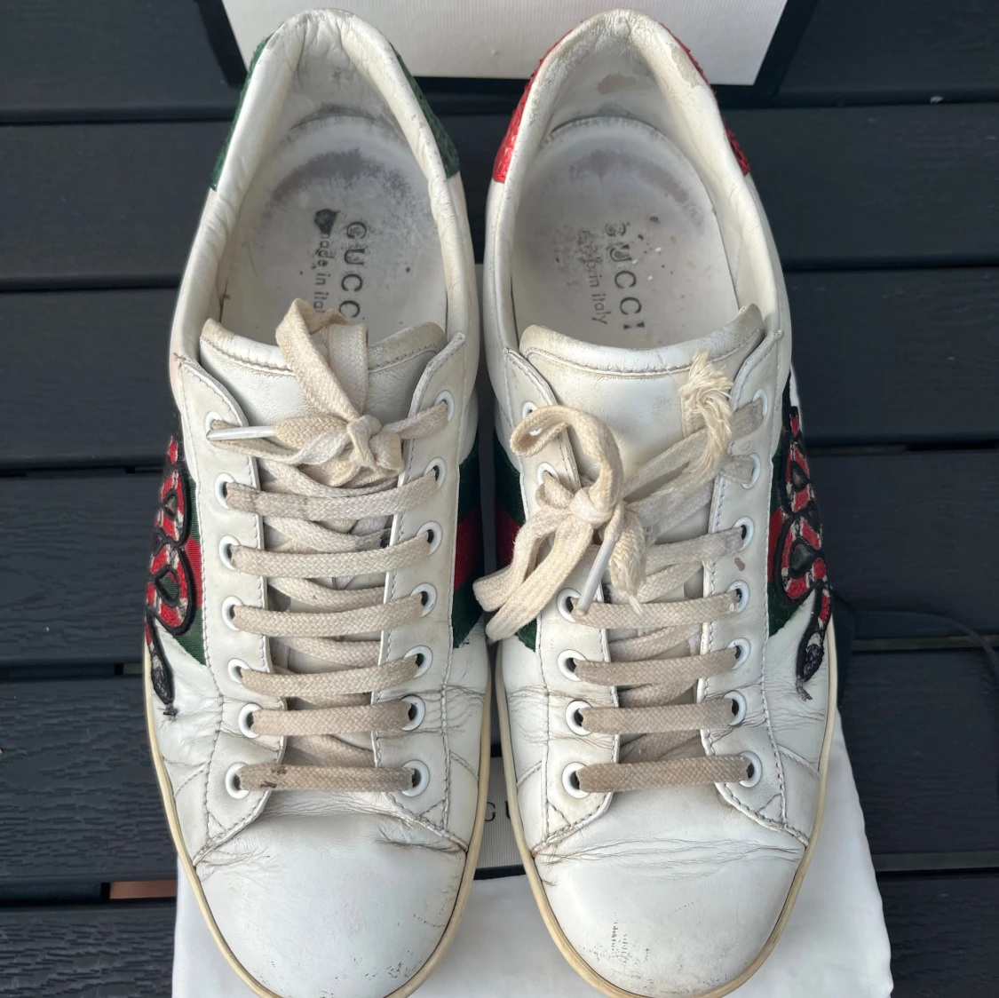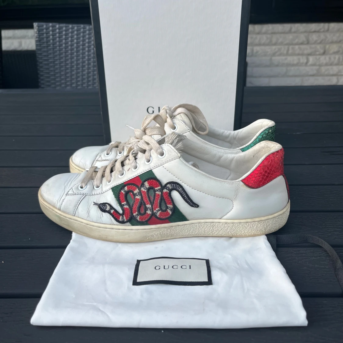 Tjena, säljer nu dessa riktigt snygga och populära Gucci ace skorna, de är i använt skick som visas på bilderna men har liv kvar i sig, box och dustbag ingår, Uk 8/ 42/43, hör av er vid frågor och funderingar🙌🤝