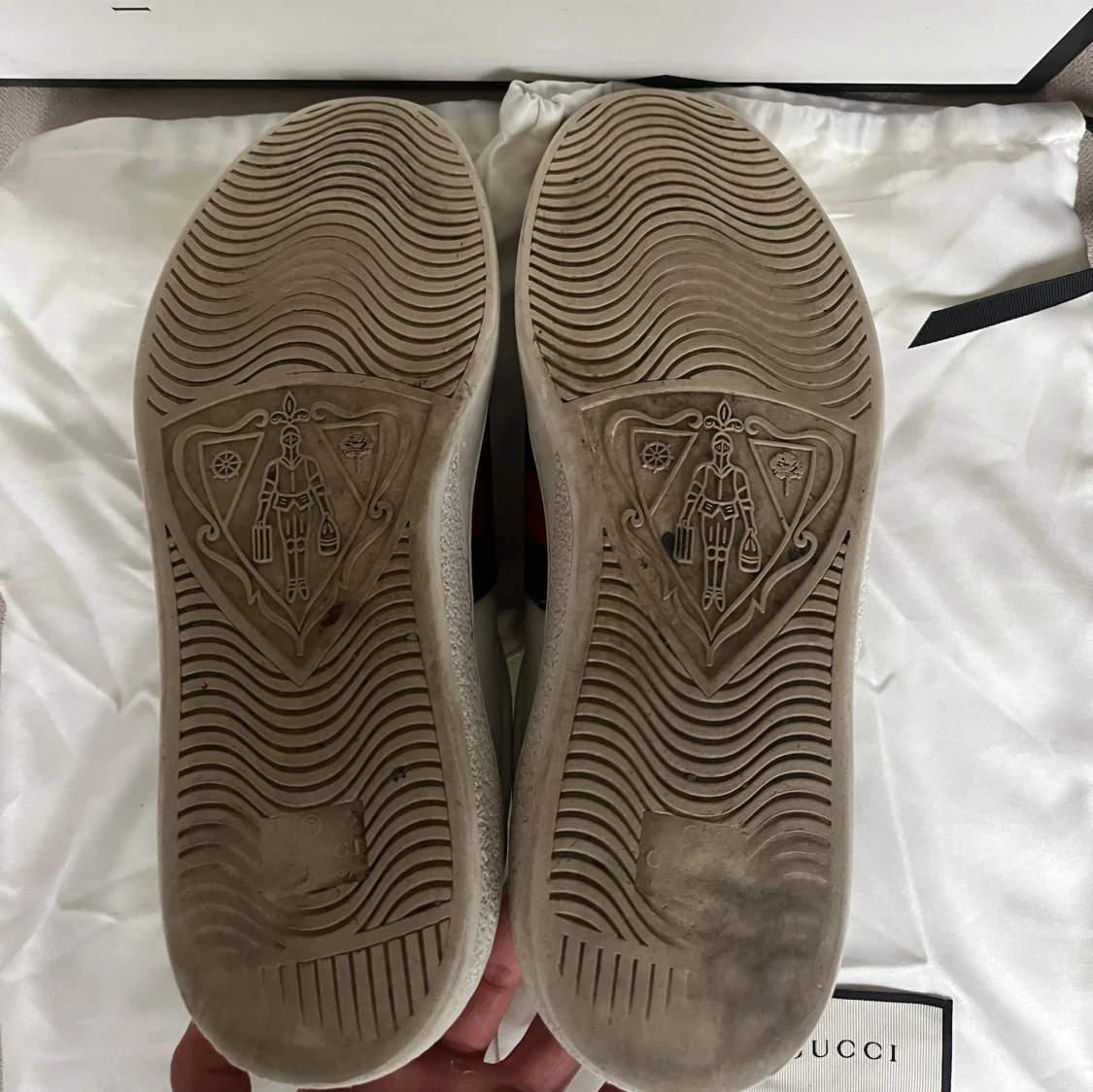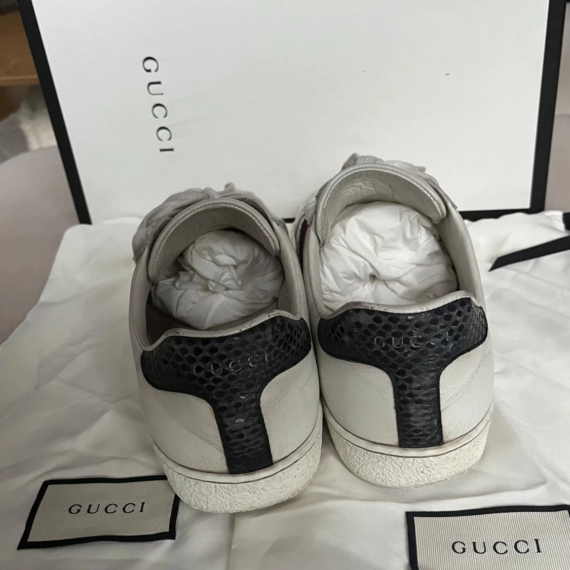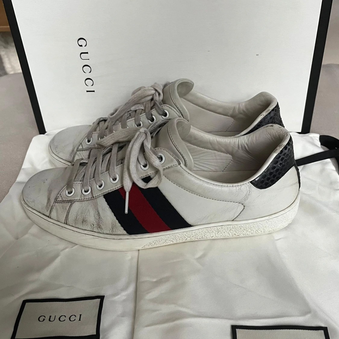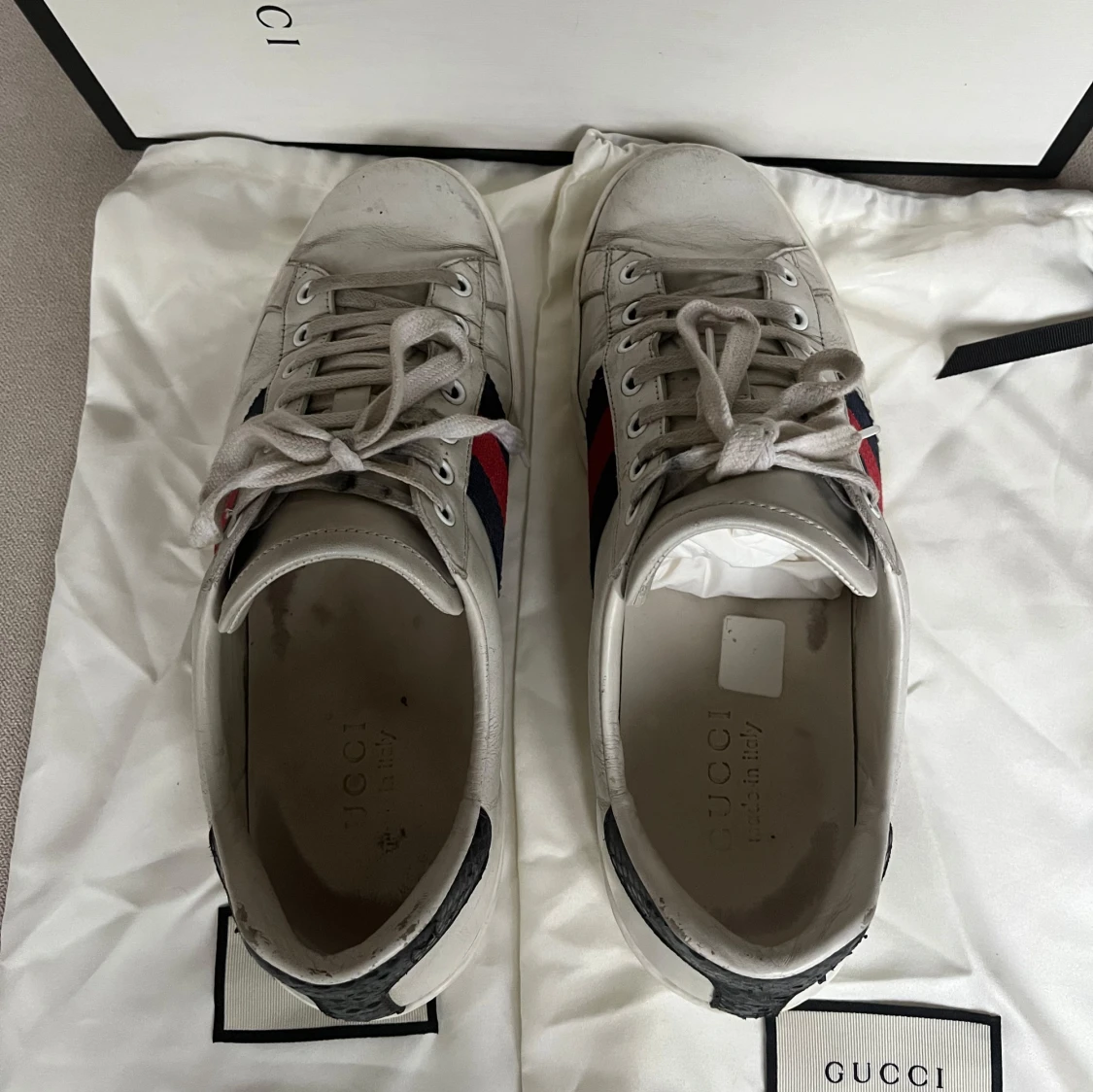 Gucci Ace sneakers i vitt skinn med klassiska röd- och blåa ränder på sidan. Baksidan har svart ormskinnsmönstrad detalj med Gucci-logga. Platt sula, snörning och rund tå. Skorna har slitage o litet hål och därav priset men har mycket kvar att ge. Perfekta för dig som vill ha en ikonisk och stilren sneaker med lyxig känsla. Kvitto finns och skorna är självklart äkta✅