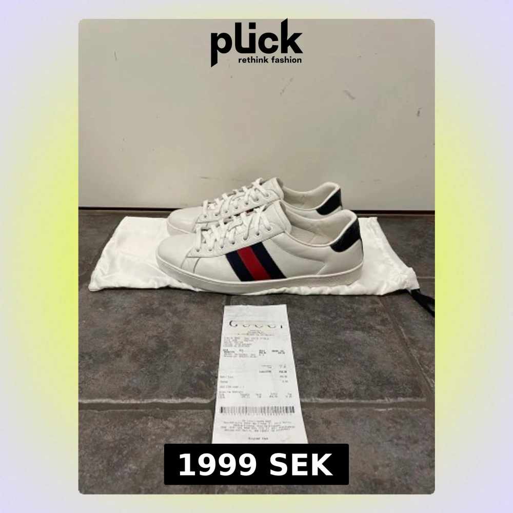 Feta Gucci Ace skor. Storlek 8 1/2 US motsvarar 42,5. De är repainted på sidan av sulan (se bild 5) annars väldigt bra skick. Kvitto och dustbag medkommer. Pris kan självklart diskuteras!!