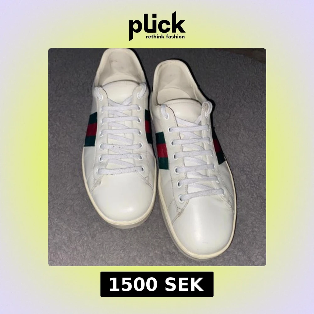 Snygga vita sneakers från Gucci med klassiska gröna och röda ränder på sidan. Skorna har en rund tå och snörning framtill. Baktill finns en grön detalj med krokodilmönster. Perfekta för en stilren look.
