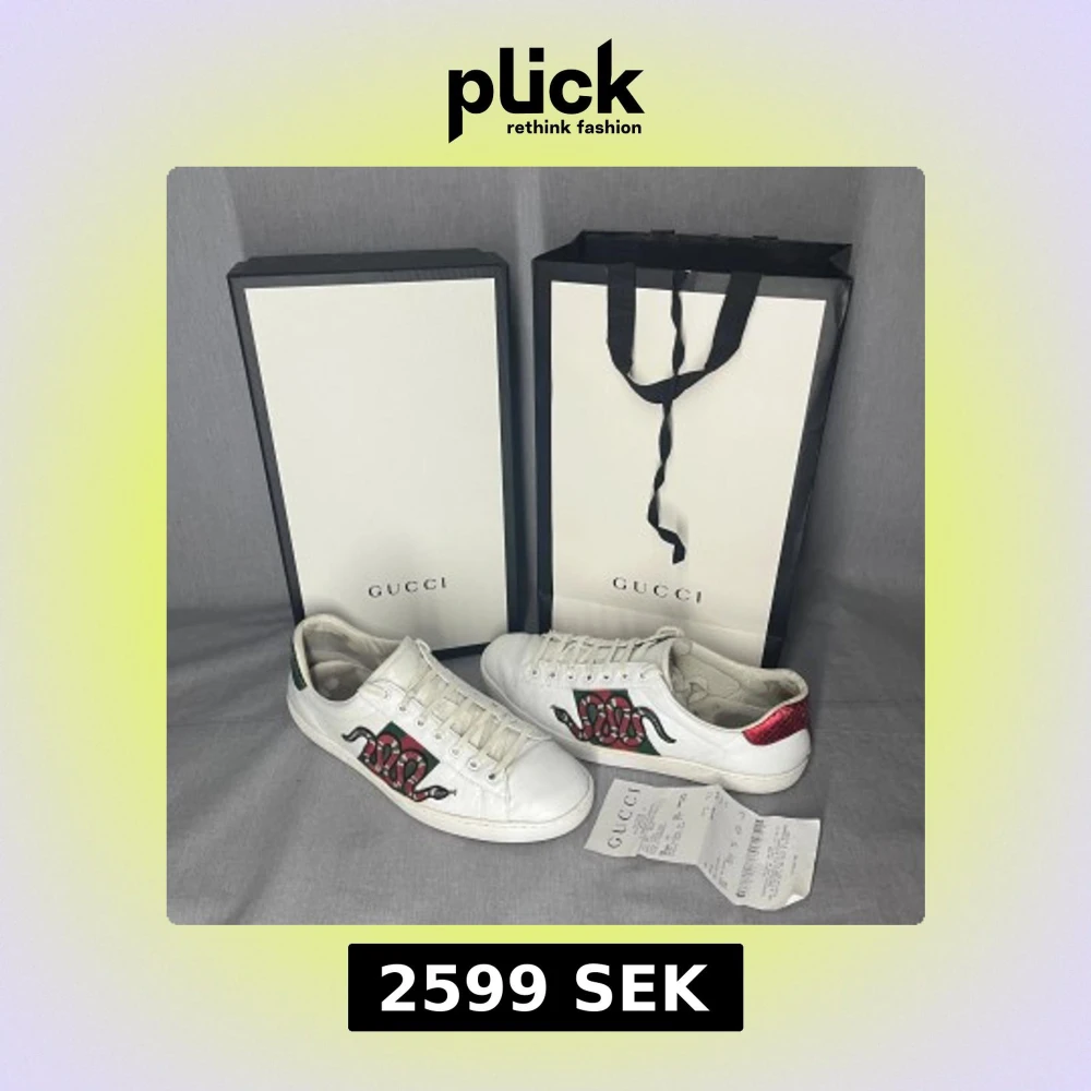 Äkta gucci ace med kvitto!! Har lite skador, lädret har spruckit vid en söm och är slitna inuti, men skulle säga att skicket är 7/10. Riktigt snygga skor som passar till alla outfits. Skriv för fler bilder eller vid funderingar 🙌😁