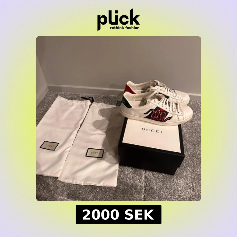 Säljer ett par vita Gucci Ace sneakers med den ikoniska ormbrodyr på sidan, gröna och röda detaljer samt metallicröd och metallicgrön häl. Klassisk låg modell med snörning och rund tå. Skorna kommer med originalpåse och låda.