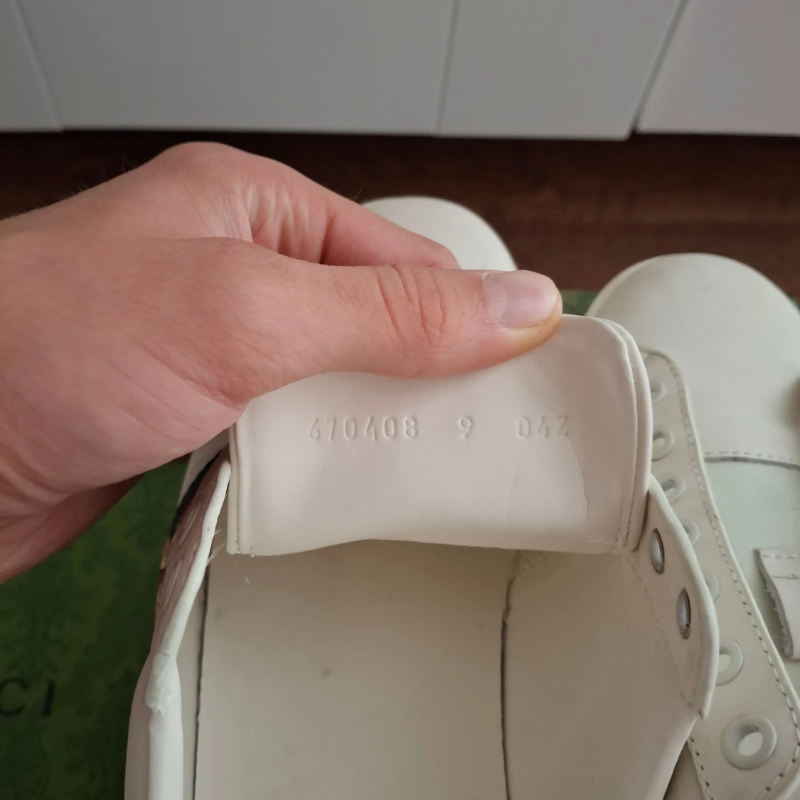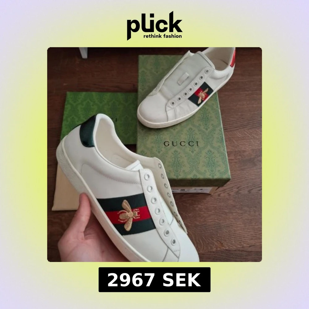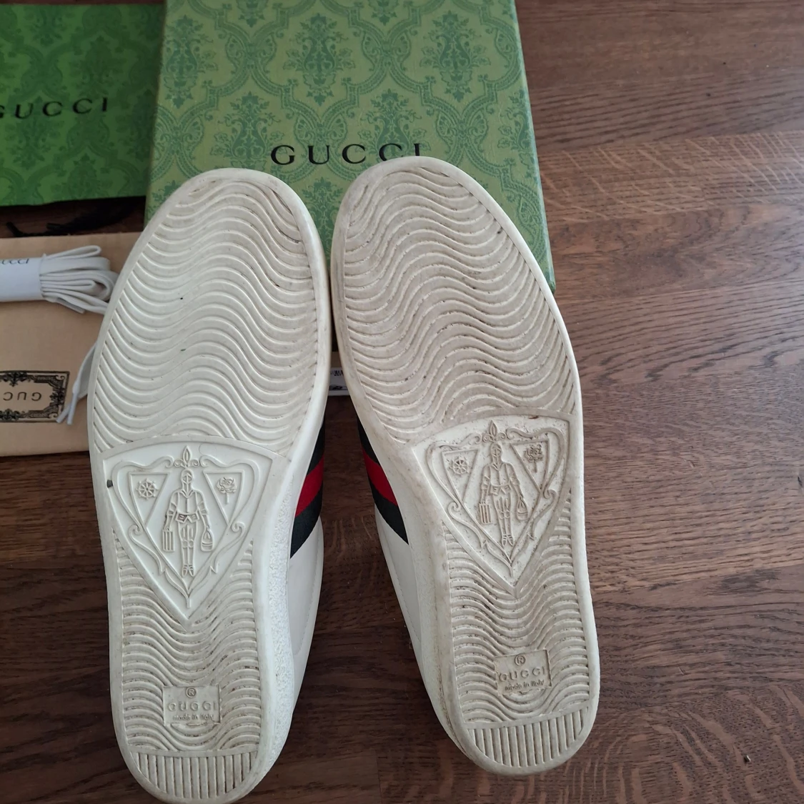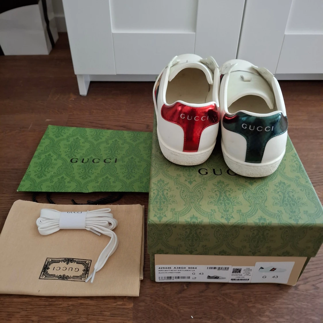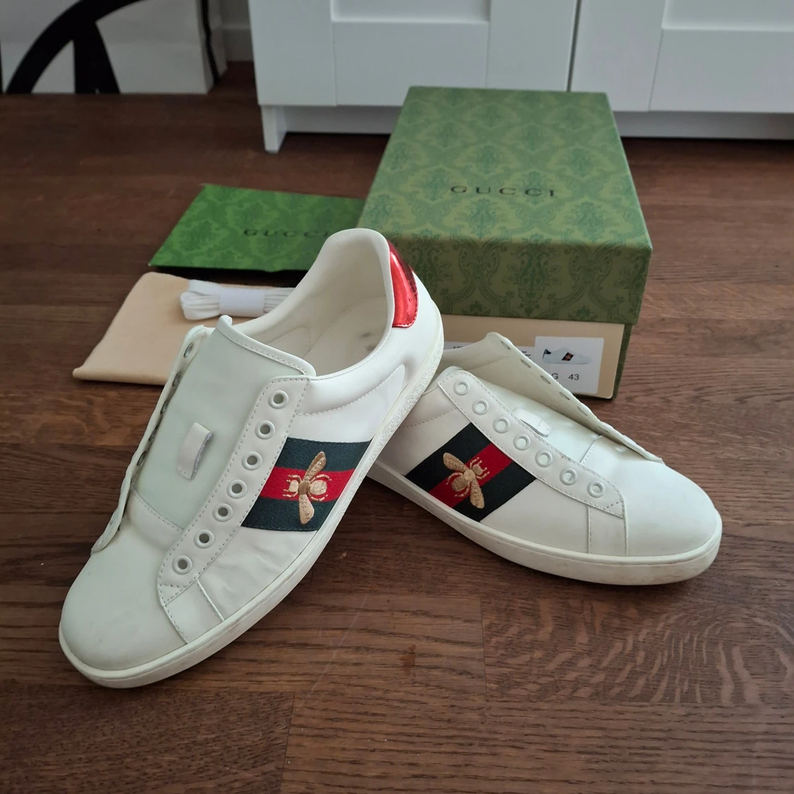Gucci Ace sneakers i vitt skinn med klassiska gröna och röda ränder på sidan, dekorerade med en broderad guldfärgad bi. Baksidan har metallicröd och metallicgrön detalj med Gucci-logga. Platt sula och rund tå. Allt og medföljer. Skick 9/10. Priset är inte hugget I sten.