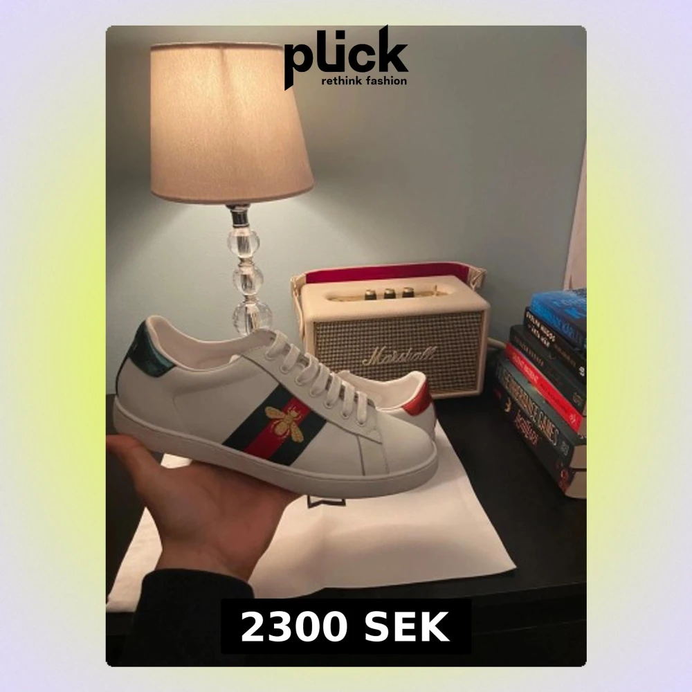 Gucci Ace sneakers i vitt skinn med klassiska gröna och röda ränder på sidan och broderad guldfärgad bi. Baksidan har metallicröd och metallicgrön hälflik med textur. Platt sula med Gucci-logga och mönstrad undersida. Snygg och ikonisk modell för dig som gillar lyxiga detaljer.