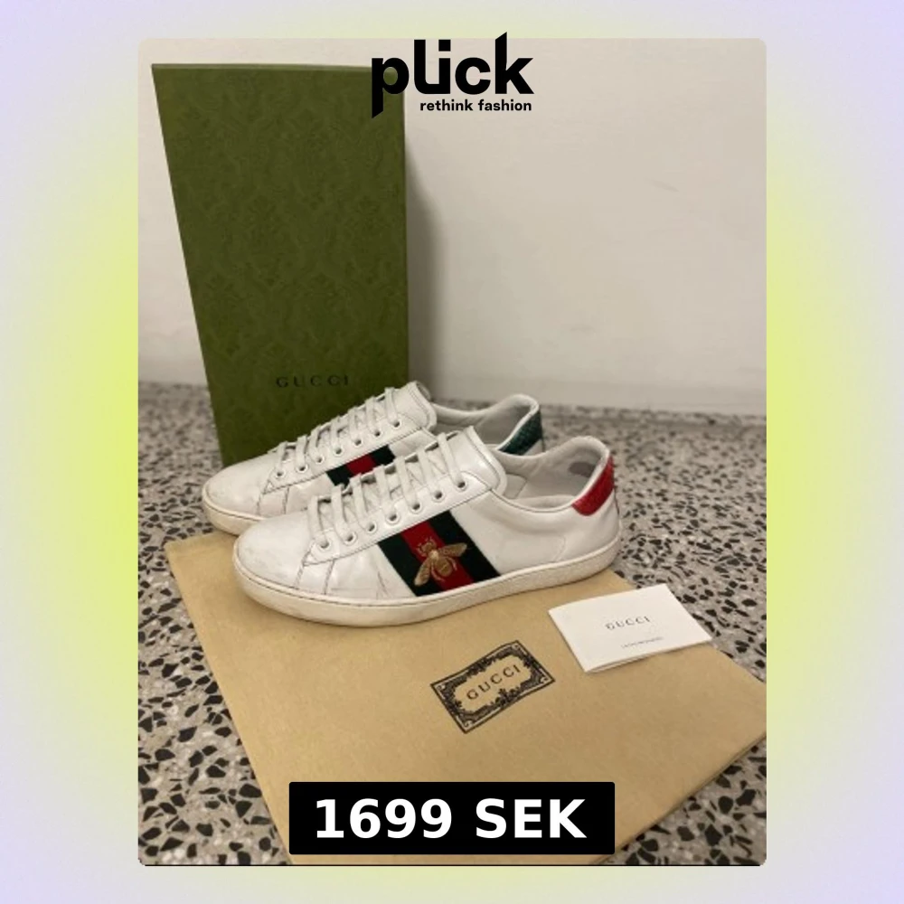 Gucci Ace sneakers i vitt skinn med klassiska gröna och röda ränder på sidan och broderad guldfärgad bi. Baksidan har metallicröd och metallicgrön detalj med textur. Platt sula, rund tå och snörning. Kommer med originalkartong och dustbag.