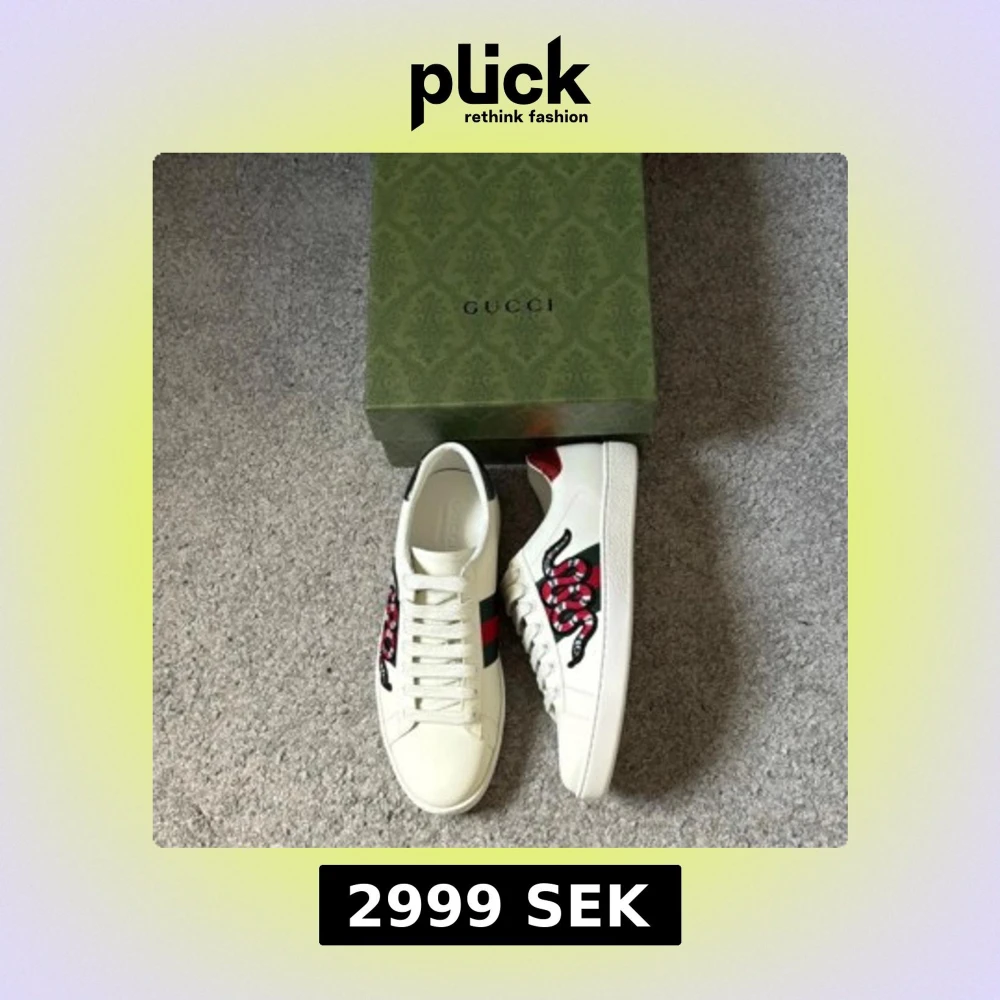 Gucci Ace sneakers i vitt skinn med ikonisk röd och grön rand på sidan samt broderad orm i rött, svart och vitt. Baksidan har metallicröd och metallicgrön detalj med Gucci-logga. Klassisk rund tå och snörning. Perfekta för dig som vill sticka ut.