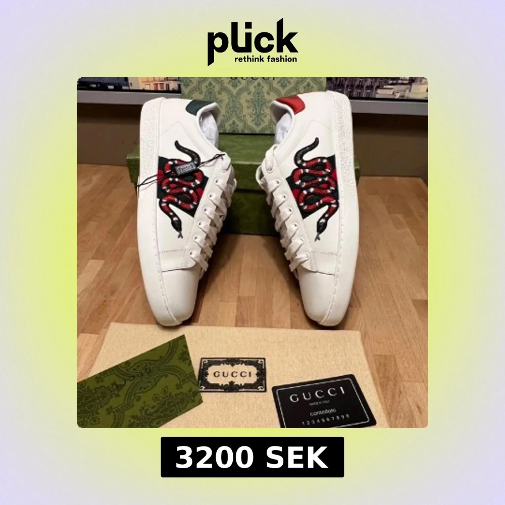 Gucci Ace sneakers i vitt skinn med ikonisk röd och svart orm brodyr på sidan. Baksidan har metallicröd detalj på ena skon och metallicgrön på den andra, båda med Gucci-logga. Klassiska gröna och röda ränder på sidan. Snygga snörade sneakers med platt sula.