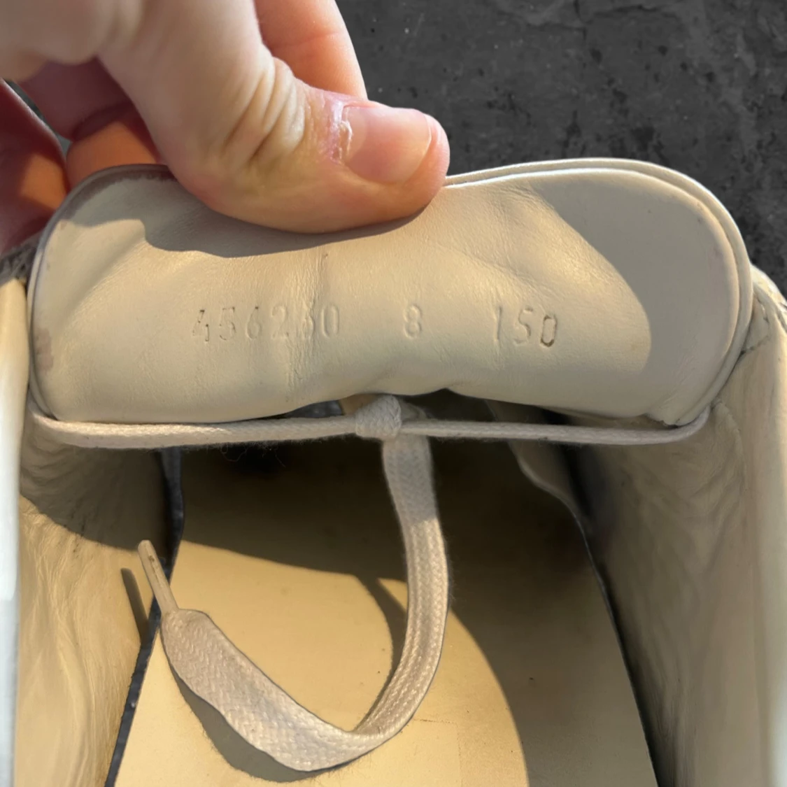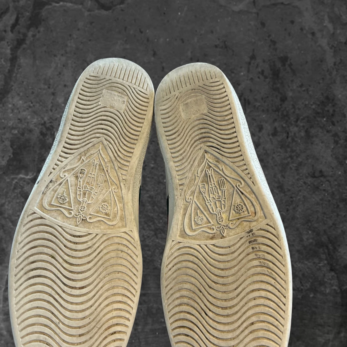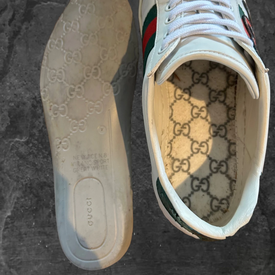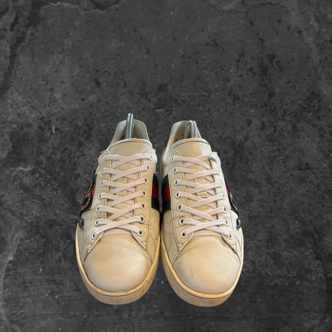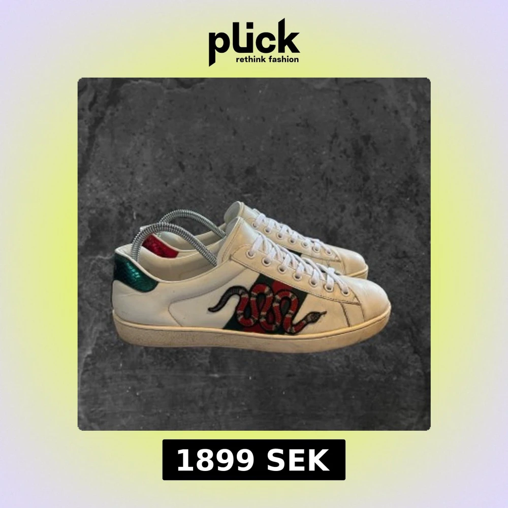 Säljer ett par vita Gucci sneakers i skinn med broderad röd och svart orm på sidan, gröna och röda detaljer på hälen och klassisk snörning. Snygg platt sula med unikt mönster undertill. Perfekt för dig som vill sticka ut med lyxig streetstyle.
