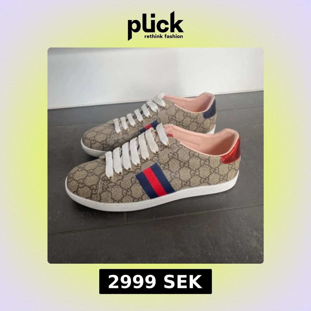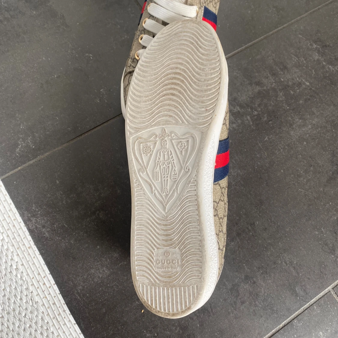 Snygga Gucci sneakers med klassiskt GG-monogram i beige och brunt. Skorna har vita snören, röd och blå rand på sidan samt metallicröd och metallicblå häl med Gucci-logga. Yttermaterial i canvas och detaljer i skinn. Perfekta för dig som vill sticka ut med lyxig streetstyle.