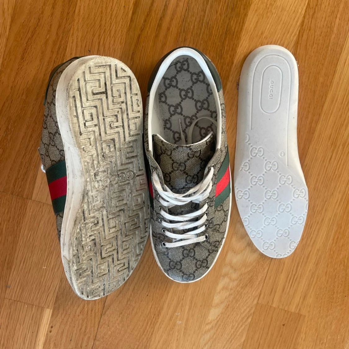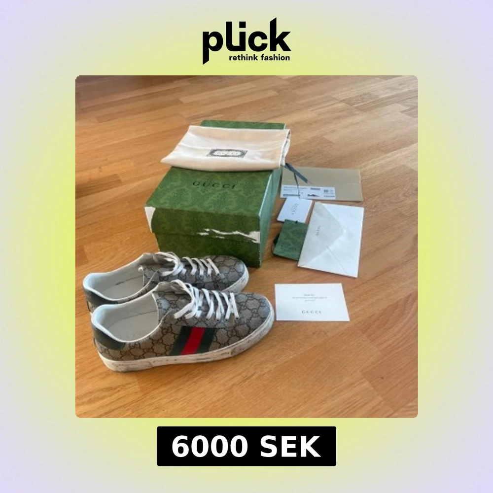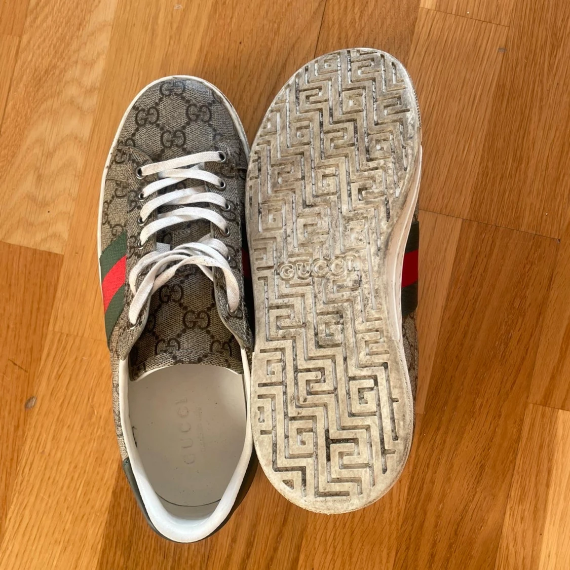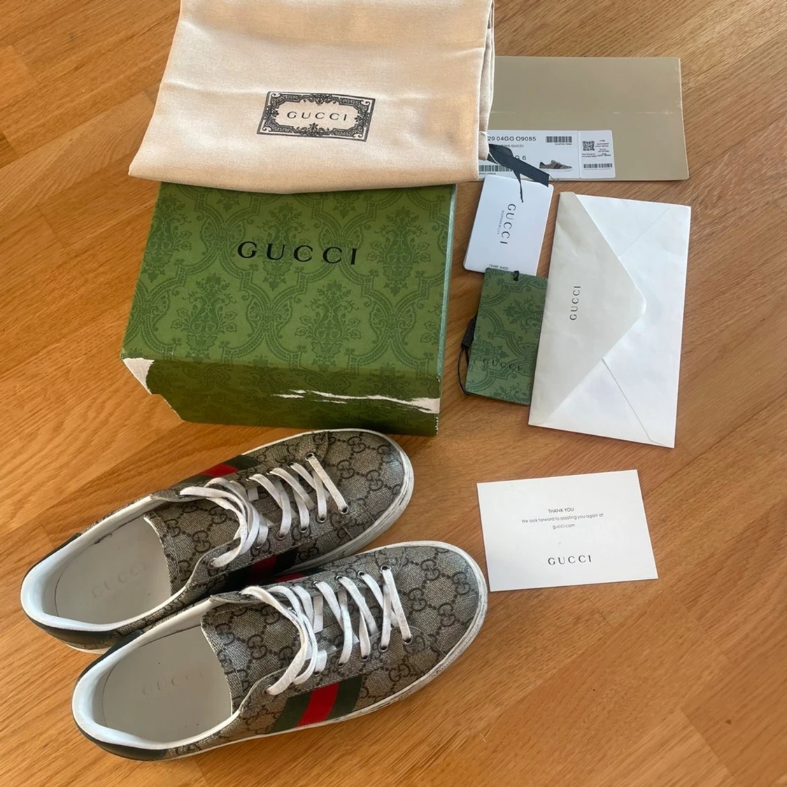 Gucci Ace sneakers i canvas med klassiskt GG-monogram, gröna och röda ränder på sidorna och vita snören. Skorna har vit gummisula med mönster och vita detaljer vid hälen. Kommer med originalkartong, dustbag och tillbehör. Perfekta för dig som vill sticka ut med lyxig streetstyle. Skriv för mer info (ÄKTA KVITTO FINNS)