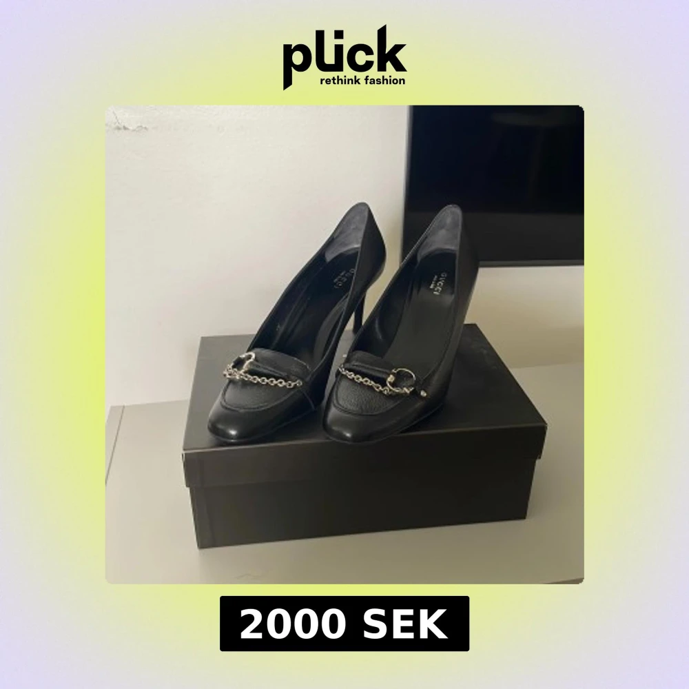 Eleganta och stiliga Gucci klackskor i helsvart. Skorna har en silvrig kjedja som detalj på framsidan och har bara andvänts vid få tillfällen. Skorna kommer även med den originals boxen och påsen till!