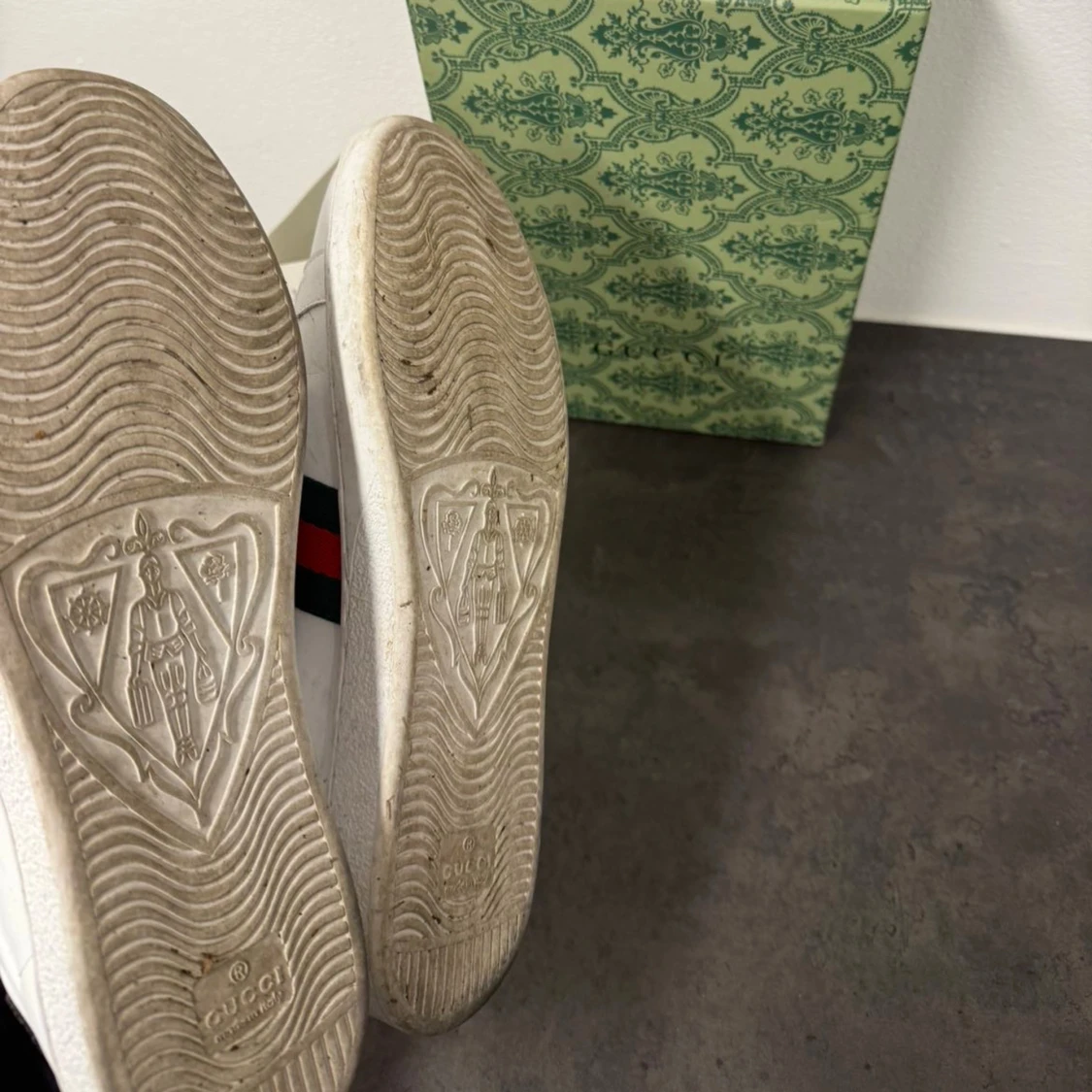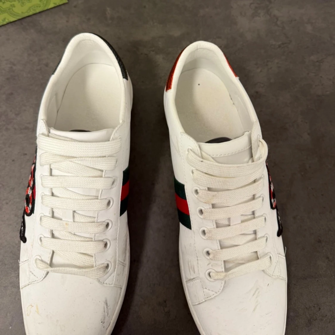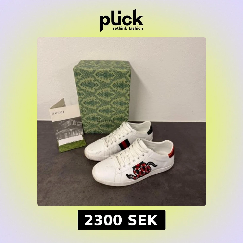 | Skor från Gucci | Storlek: 43 | Färg: vit med grönt o rött | Box ingår |