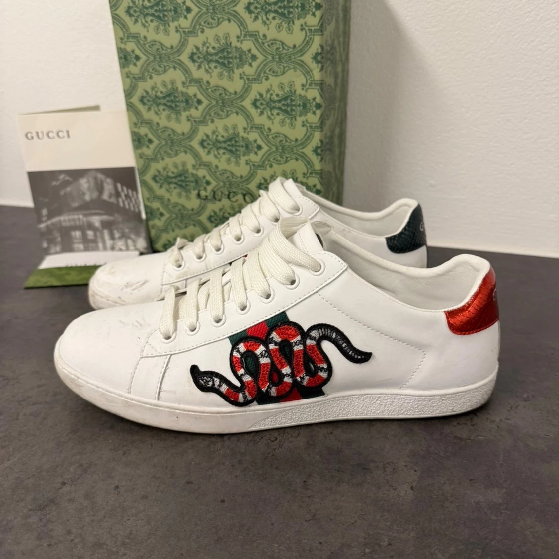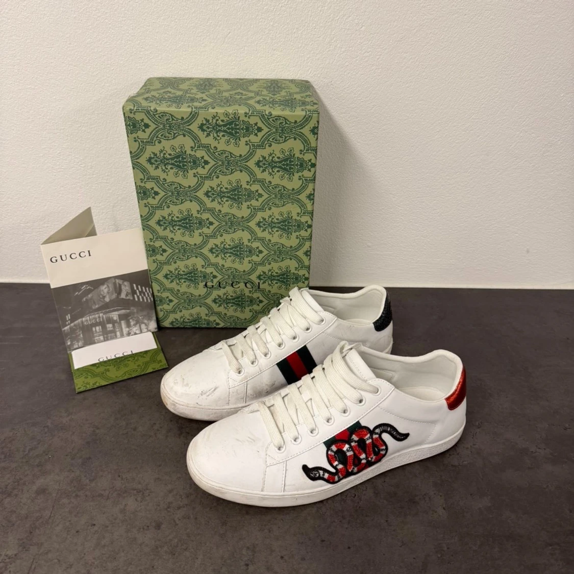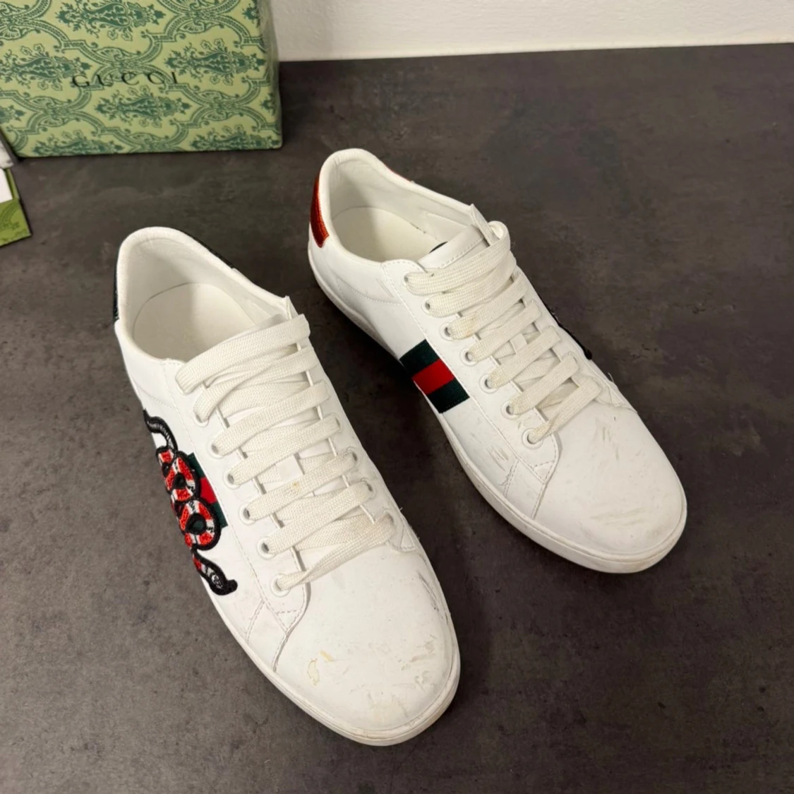 | Skor från Gucci | Storlek: 43 | Färg: vit med grönt o rött | Box ingår |
