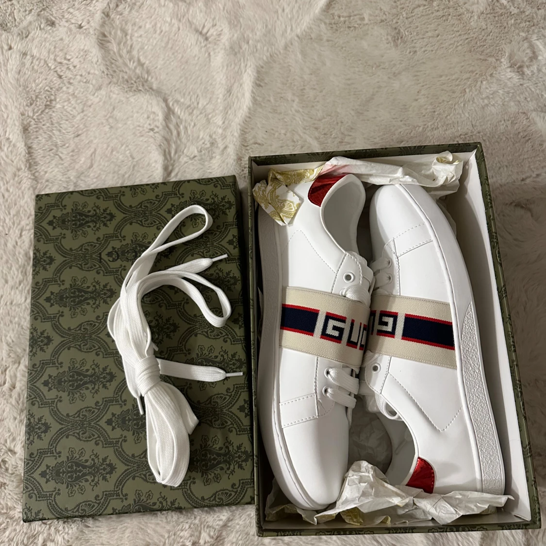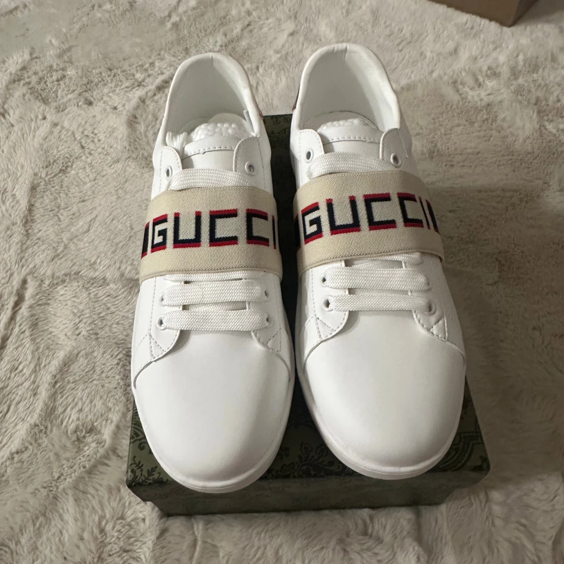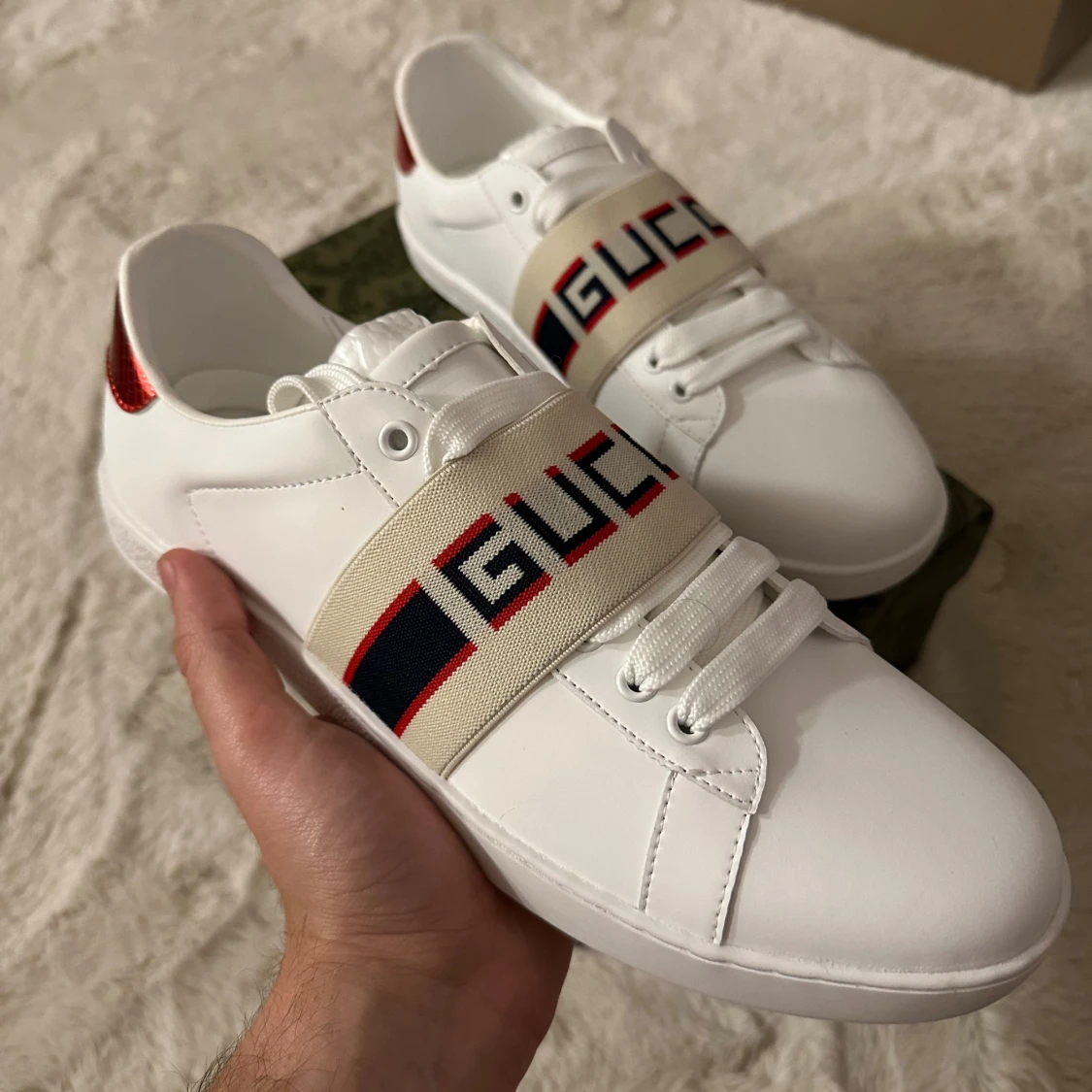 Säljer ett par vita Gucci sneakers i skinn med breda elastiska band över foten med GUCCI-logga i rött och blått. Skorna har snörning, rund tå och röd metallic-detalj på hälen. Snygg och stilren design med platt sula och exklusiv präglad undersida. Helt nya från butik kostar. Slutsålda i butik. Enda som finns i marknaden är använda. Dem här är helt nya. Med box och allt. Först till kvarn.