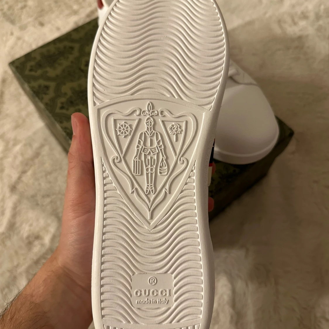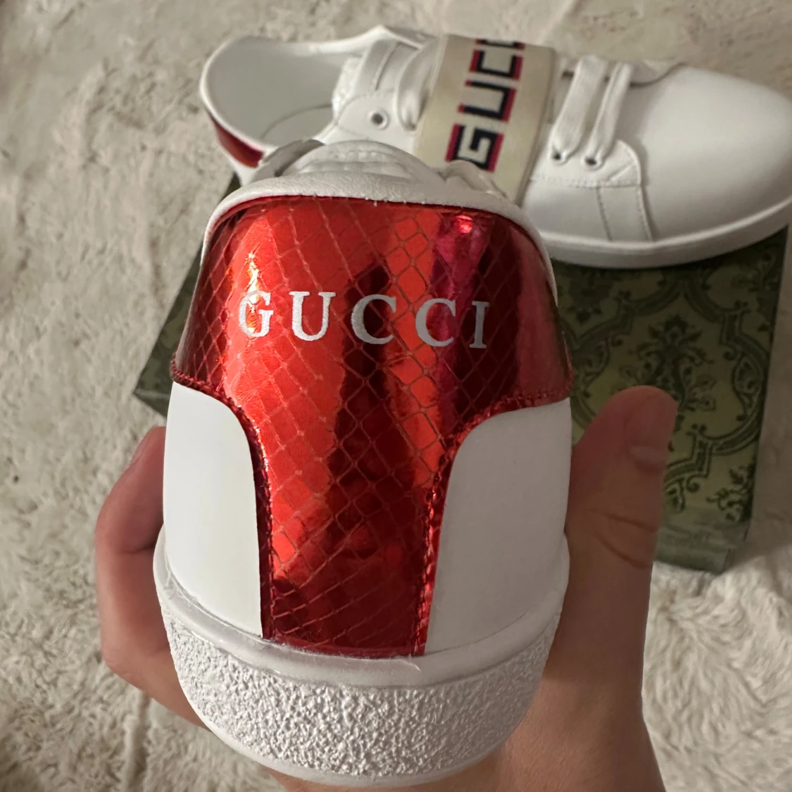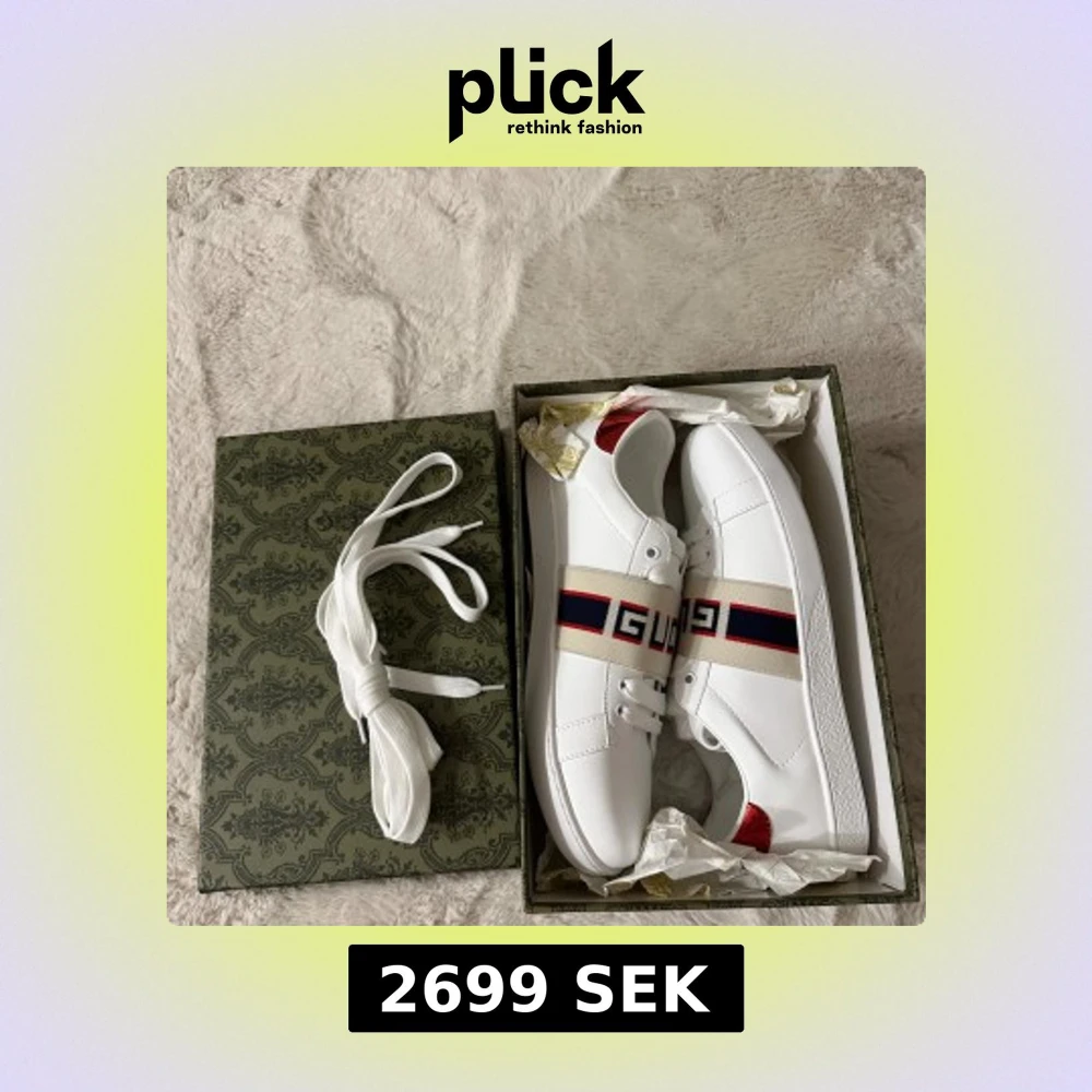 Säljer ett par vita Gucci sneakers i skinn med breda elastiska band över foten med GUCCI-logga i rött och blått. Skorna har snörning, rund tå och röd metallic-detalj på hälen. Snygg och stilren design med platt sula och exklusiv präglad undersida. Helt nya från butik kostar. Slutsålda i butik. Enda som finns i marknaden är använda. Dem här är helt nya. Med box och allt. Först till kvarn.