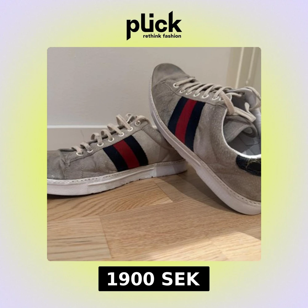 Säljer ett par klassiska Gucci sneakers i beige mocka med de ikoniska röd- och blåa ränderna på sidan. Skorna har vit sula, snörning och rund tå. Perfekta för dig som vill ha en stilren och lyxig look.