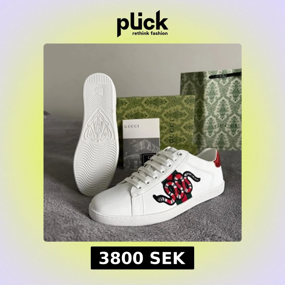 Gucci Ace sneakers i vitt skinn med broderad röd och svart orm på sidan, klassiska gröna och röda ränder, samt metallicröd och metallicgrön häl med reptilmönster. Rund tå, platt sula och snörning framtill. Snygg och ikonisk design som sticker ut.