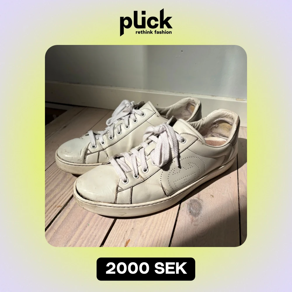 Säljer ett par vita gucci sneakers i skinn med snörning i 45/46. De har en stilren design med ett diskret gucci-mönster på sidan. Skorna är i bra skick med lite slitage på tån och hälen. Perfekta för vardagsbruk och passar till det mesta i garderoben. De är sjukt sköna men tyvärr finns det slitage där fram i i broderingen. Det kan säkert en bra skomakare lösa för en tvåhundralapp. De är köpta för 7000 i Paris. Tveka inte att höra av dig om du har frågor eller vill ha fler bilder!
