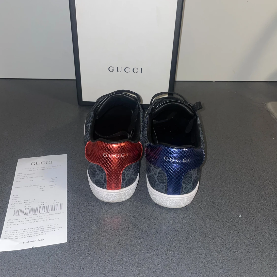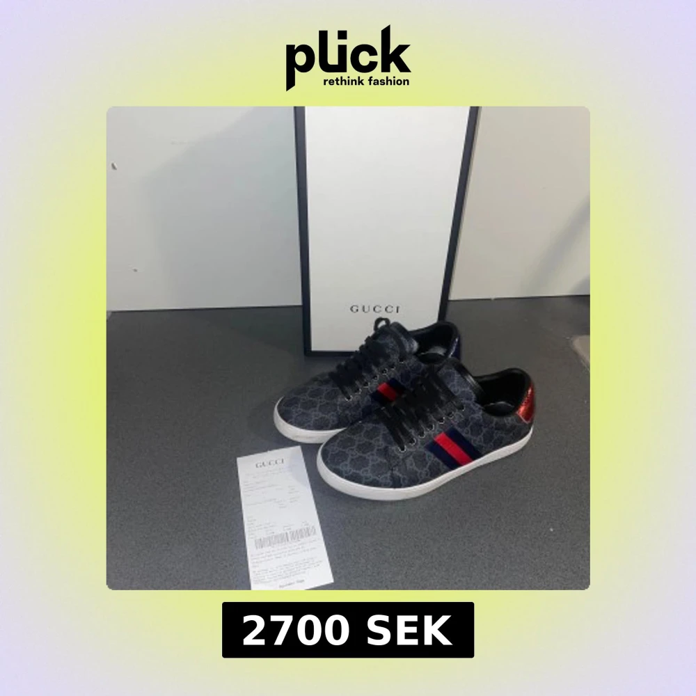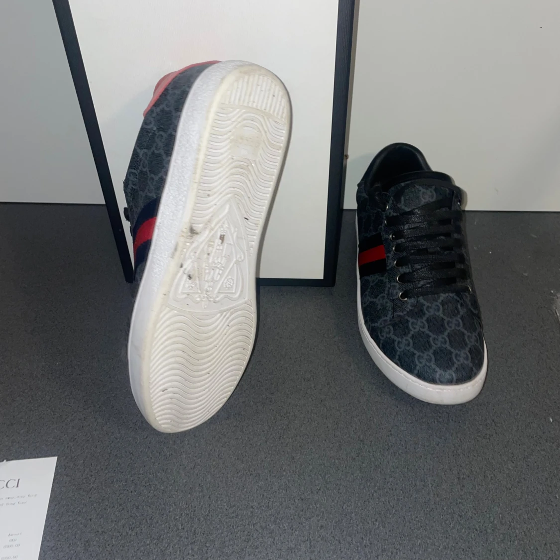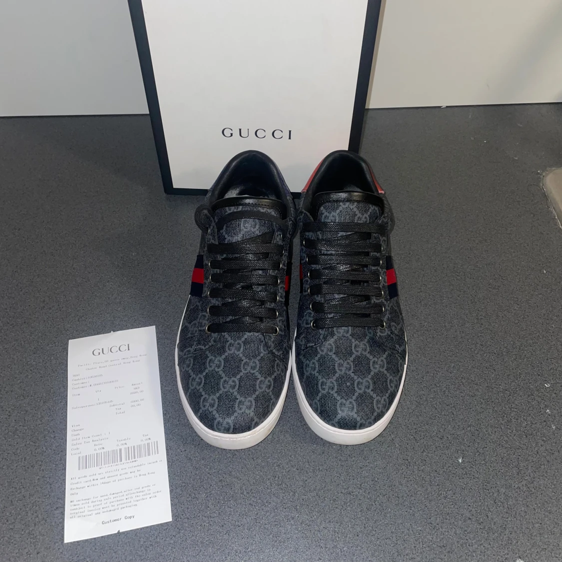 Snygga Gucci sneakers i mörkgrått med klassiskt GG-mönster, svarta skosnören och vit sula. Sidan har röd och blå rand, och baksidan har metallicröd och metallicblå detalj med Gucci-logga. Materialmix av canvas och skinn ger en lyxig känsla.
