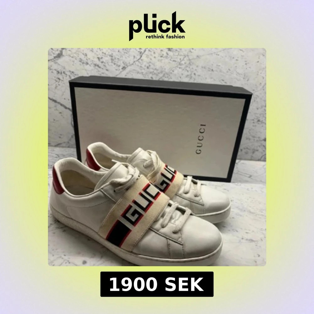 Snygga vita sneakers från Gucci med röd och svart logotyprem över snörningen. Skorna har en röd detalj på hälen och är tillverkade i skinn. De är i storlek 45 men sitter som 44. Perfekta för alla säsonger. Du får med boxen, extra snören och authority card när du köper skorna.