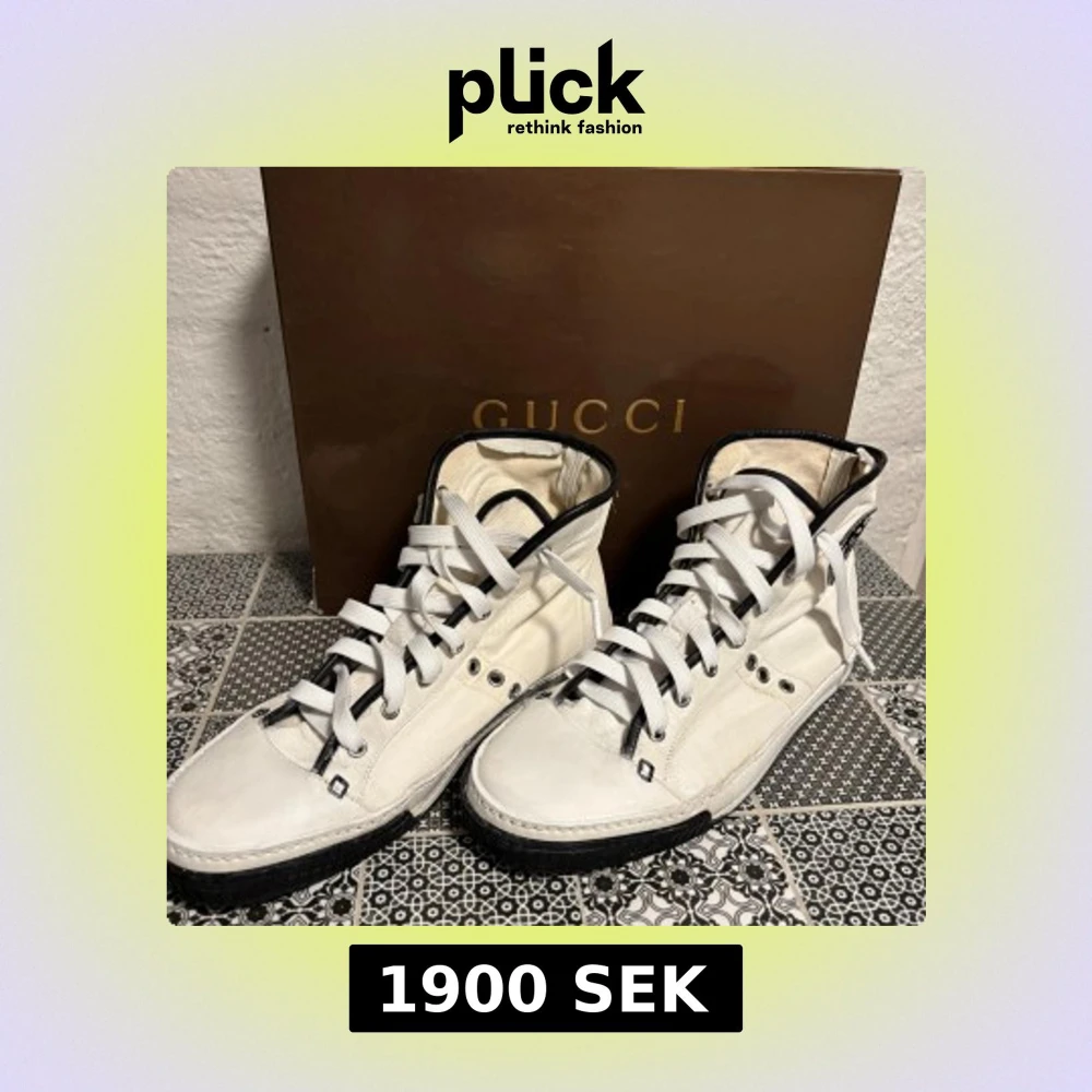 Snygga vita high-top sneakers från Gucci med svarta detaljer och svart sula. Skorna har snörning, rund tå och är tillverkade i en mix av skinn och textil. Skon och lådan är original, cirka 15 år gammal. Köpt på NK, prislapp kvar på låda.snören i original (svarta) ingår samt ett par helt nya Gucci-snöre. Canvasen är behandlad och sträv på utsidan. Snören är nya (vita) sulan är behandlad med sneakerfärg. Låda, påse, snöre i original ingår.