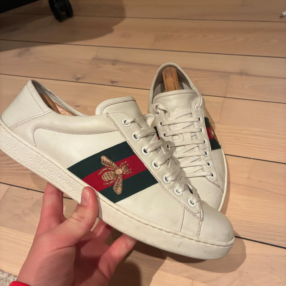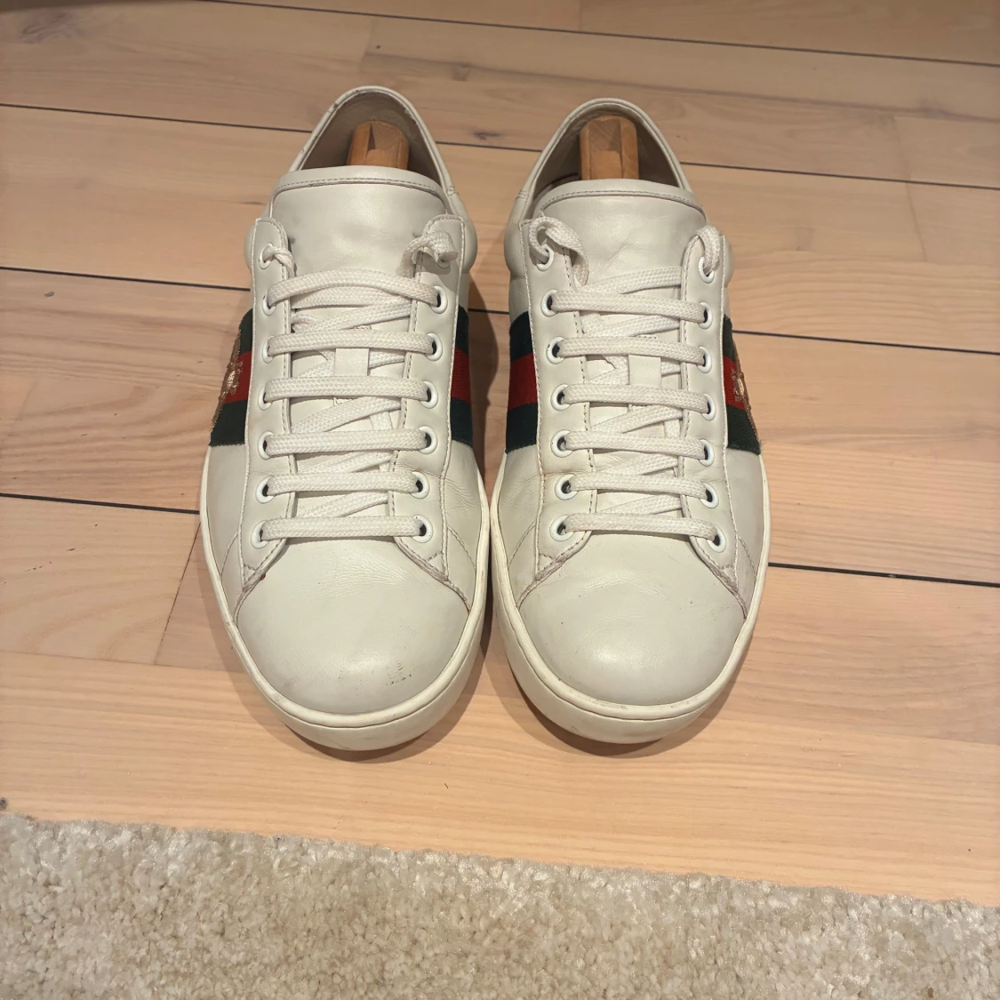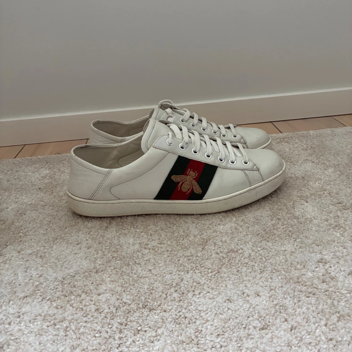 Säljer ett par vita Gucci ace bee i storlek 42 men passar även 43. Skick 7/10. Hör av dig vid minsta lilla fundering.