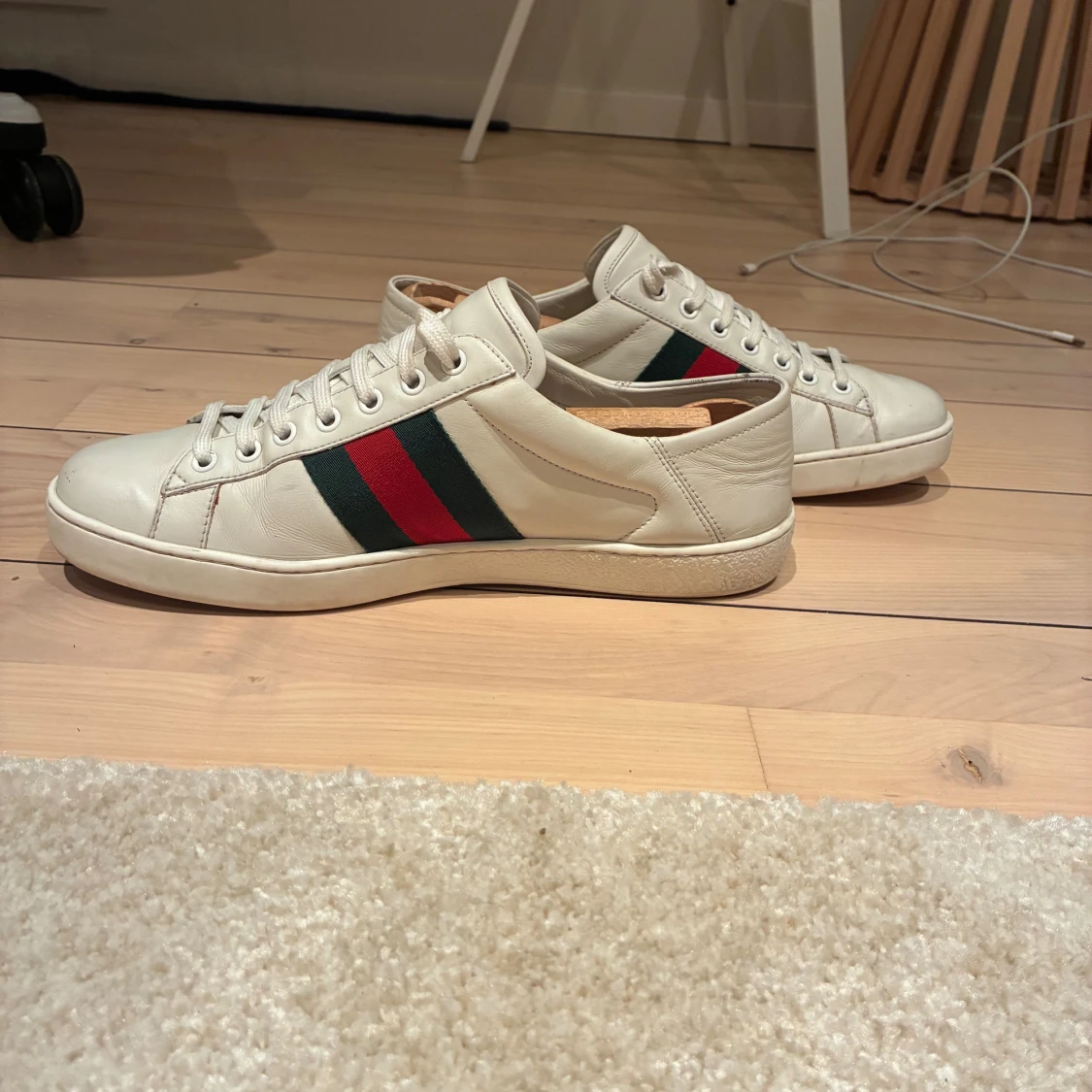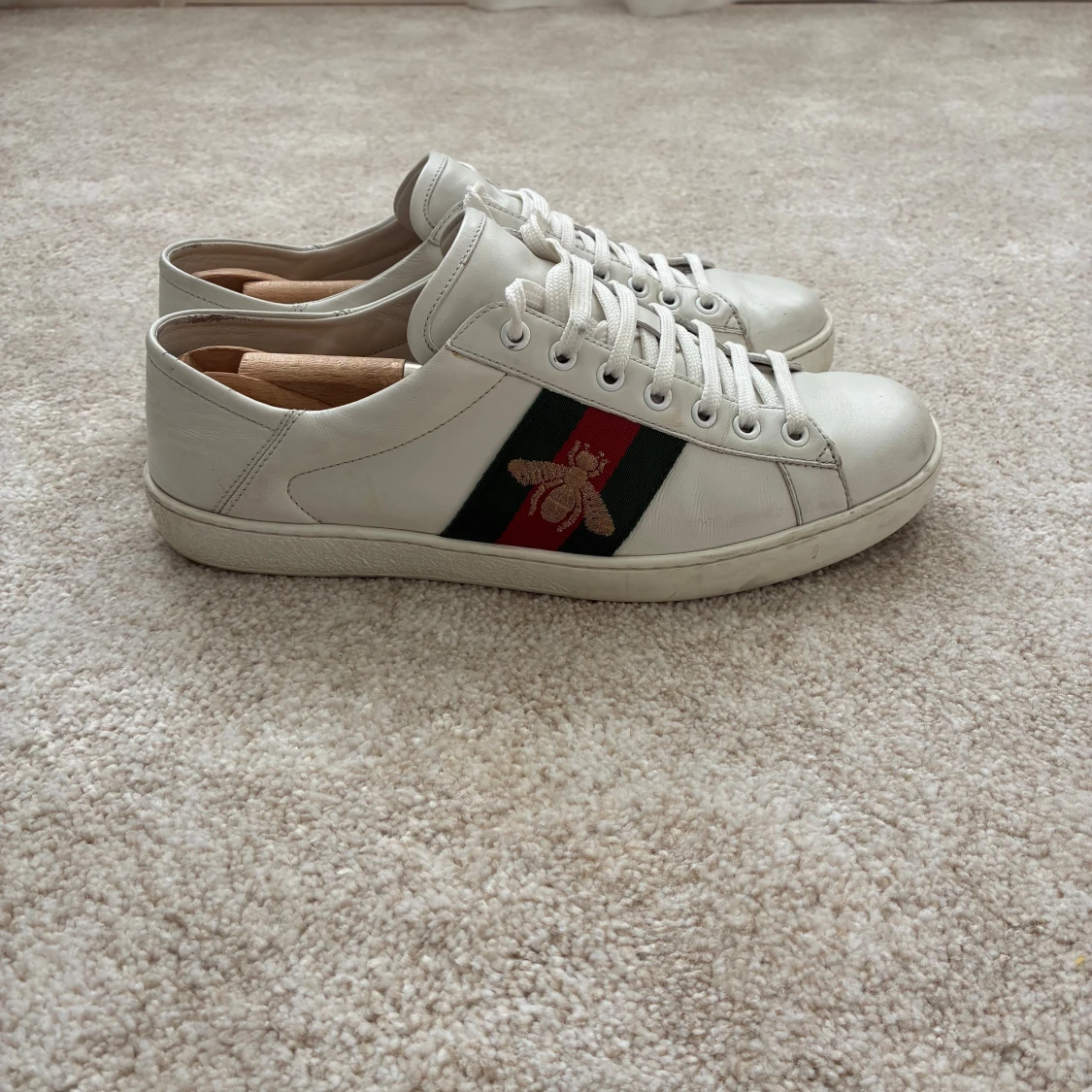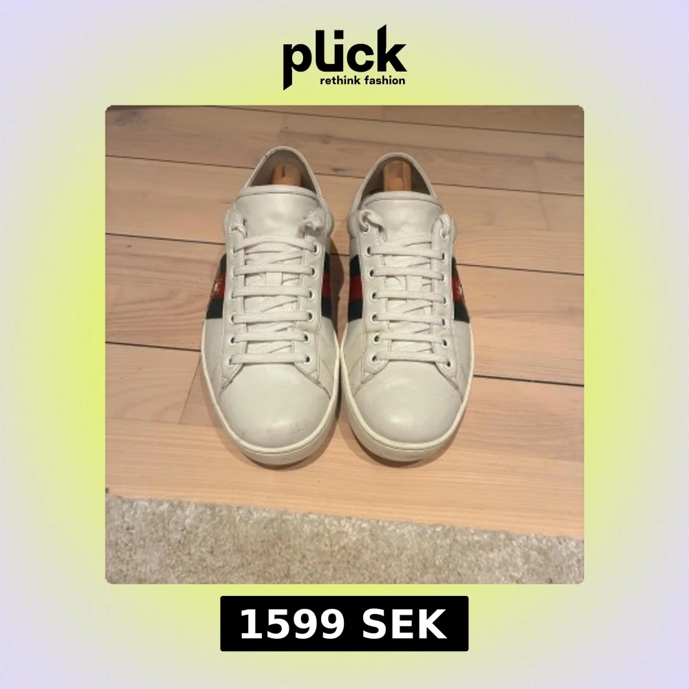 Säljer ett par vita Gucci ace bee i storlek 42 men passar även 43. Skick 7/10. Hör av dig vid minsta lilla fundering.