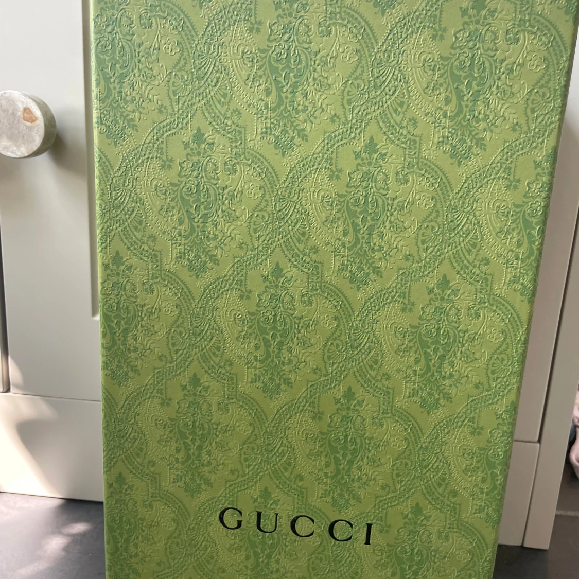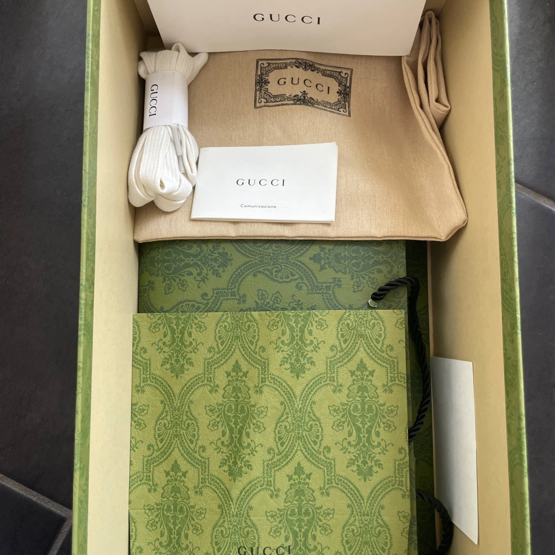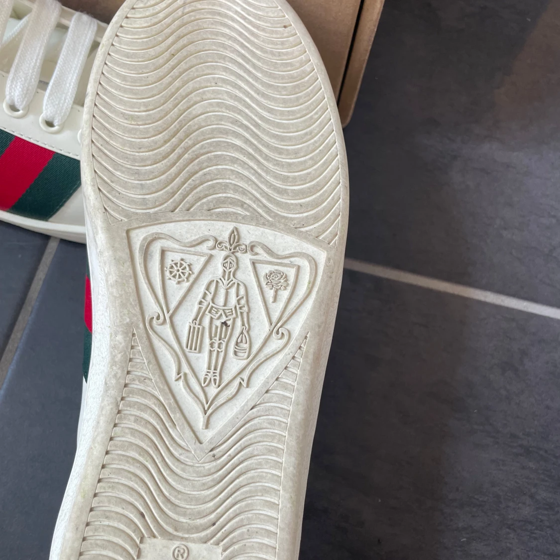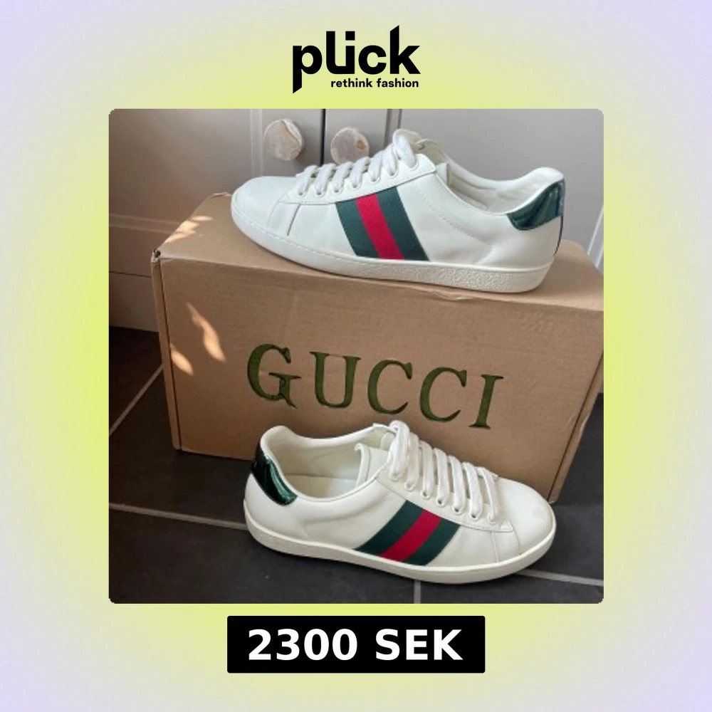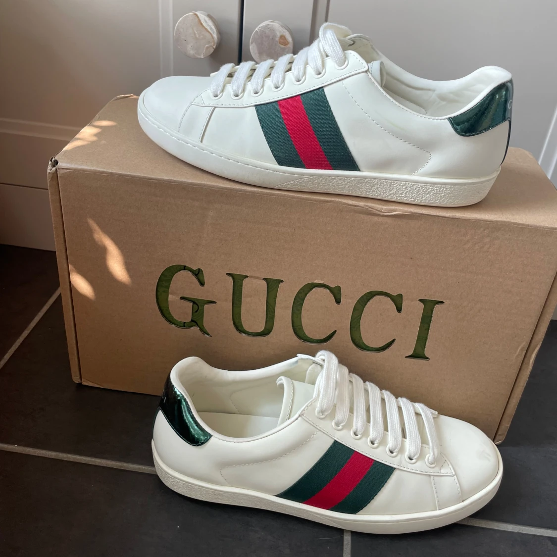 Säljer ett par vita Gucci ace sneakers med klassiska gröna och röda ränder på sidan och metallicgrön häl. Skorna har vit snörning och platt sula. Kommer med originalkartong, extra skosnören och dustbag.