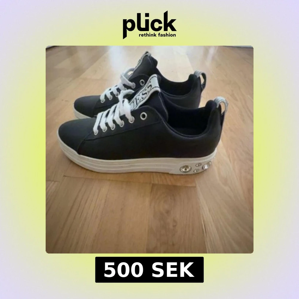 Svarta sneakers från Guess med vit sula och vita snören. Snygga detaljer med stora strass-stenar på baksidan av sulan och tydlig Guess-logga på plösen och hälen. Skorna har rund tå och platt sula, tillverkade i syntetmaterial.