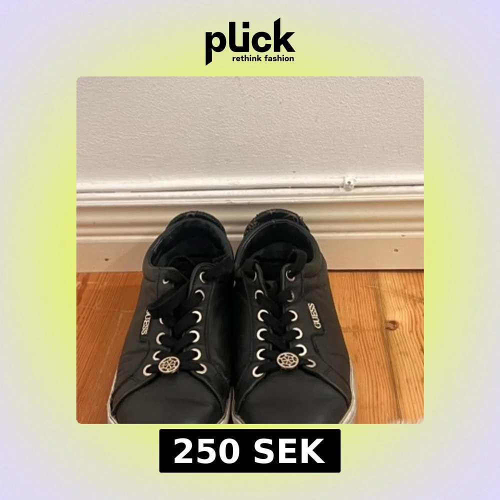 Snygga svarta sneakers från Guess med snörning och metalliska detaljer. Perfekta för en stilren look. Märkeslogga på sidan och hälen ger en exklusiv touch. Skorna är lite slitna och smutsiga men det går att rensa.