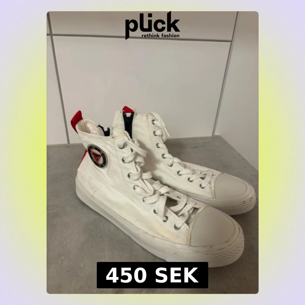 Säljer ett par vita high top sneakers från Guess med röd detalj längs hälen och klassisk Guess-logga på sidan. Skorna har snörning framtill, dragkedja på insidan och platt sula. Tillverkade i bomullscanvas med gummitå och sula. Perfekta för dig som gillar streetstyle och vill sticka ut.