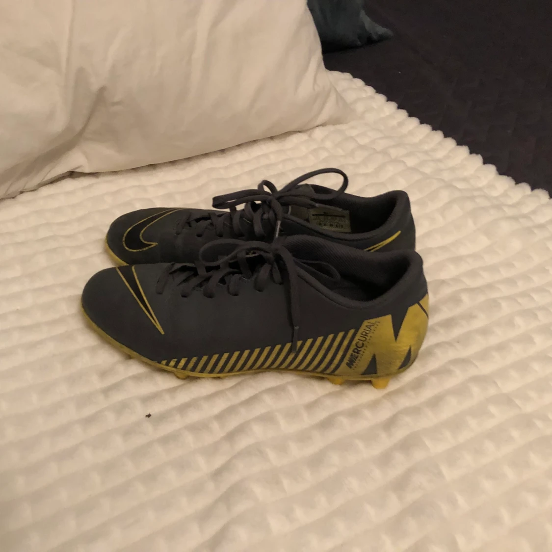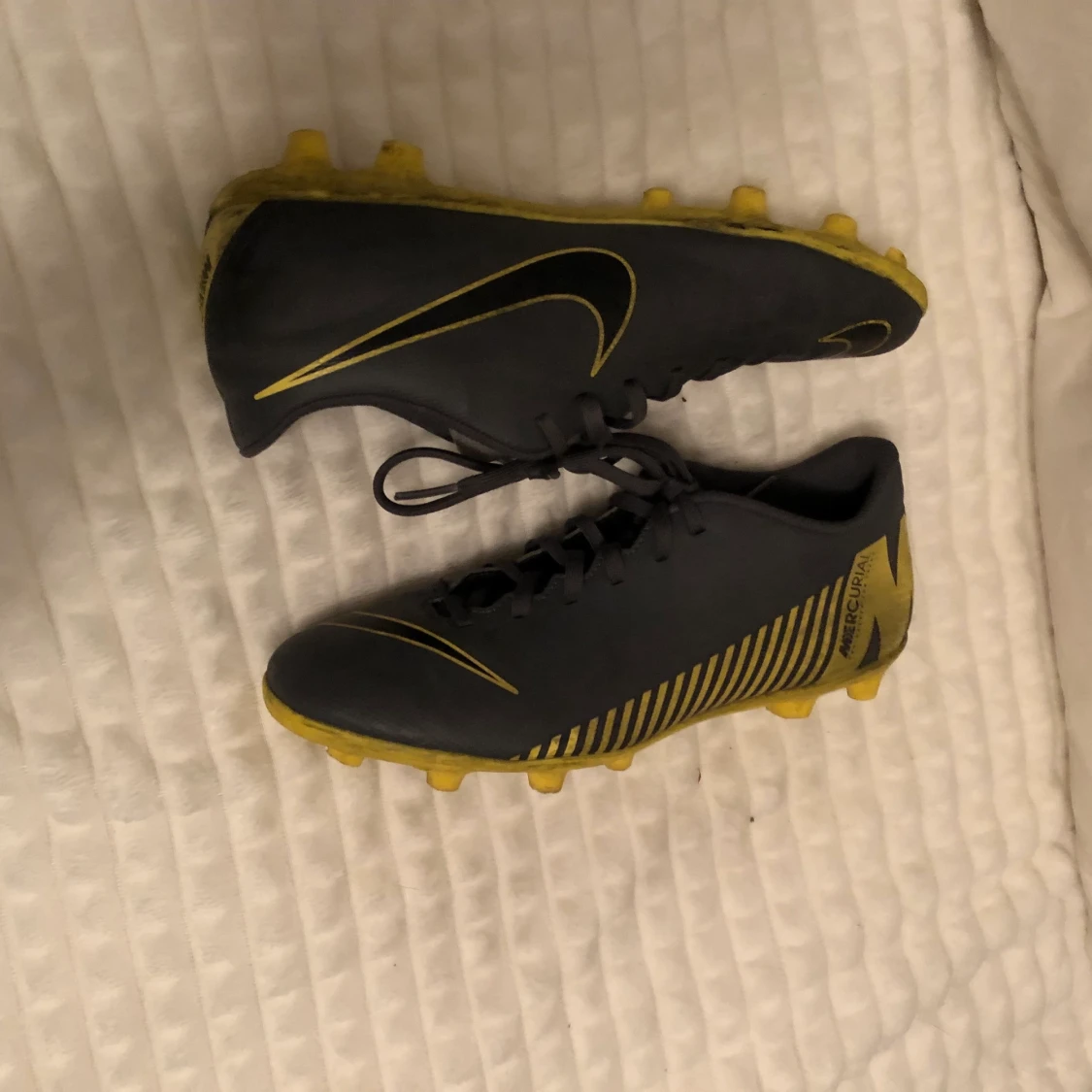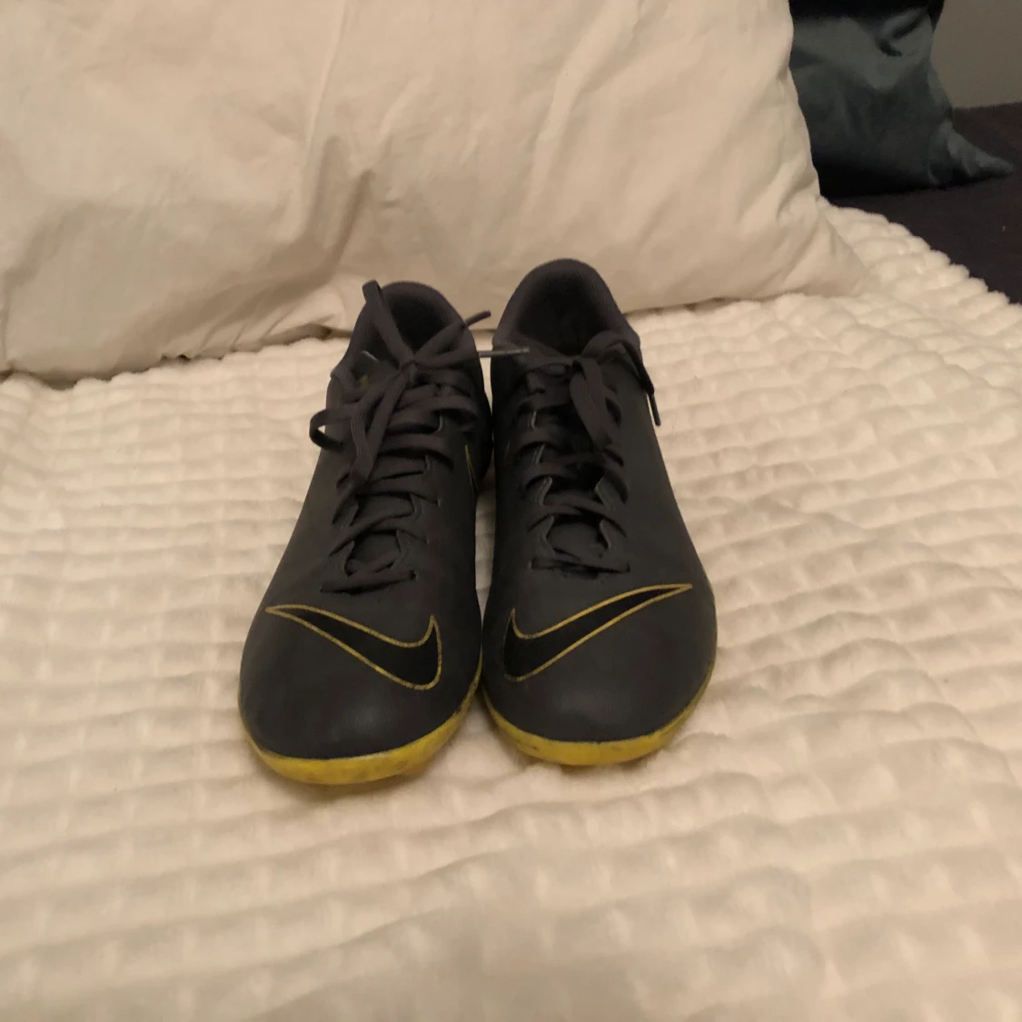 Grå/gula fotbollsskor i använt skick. Inte trasiga.