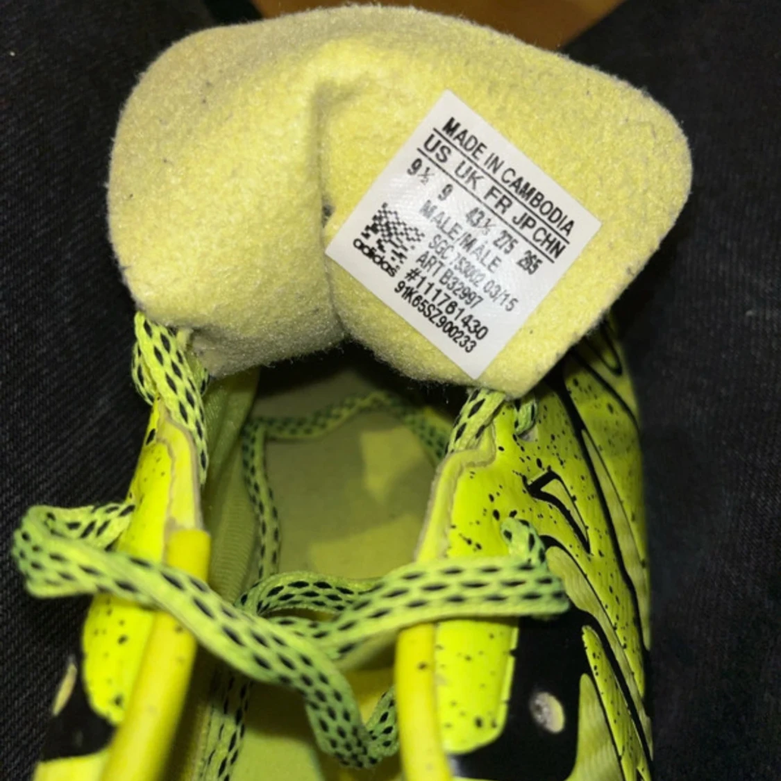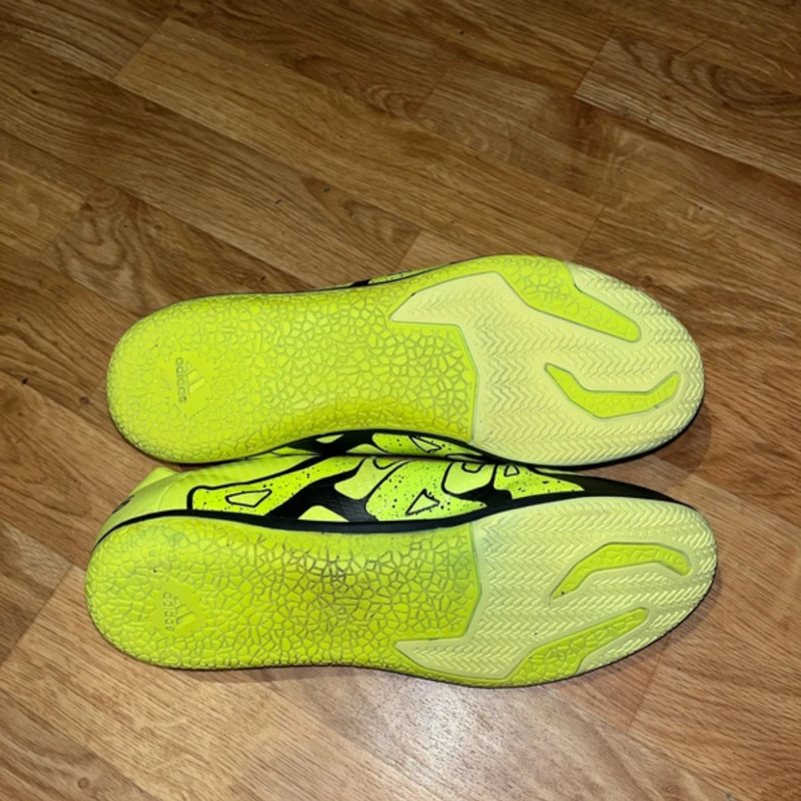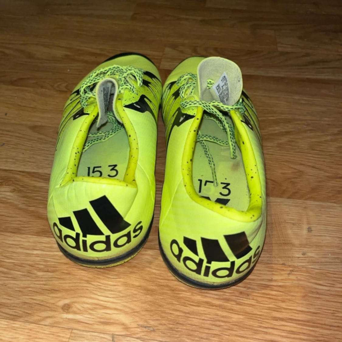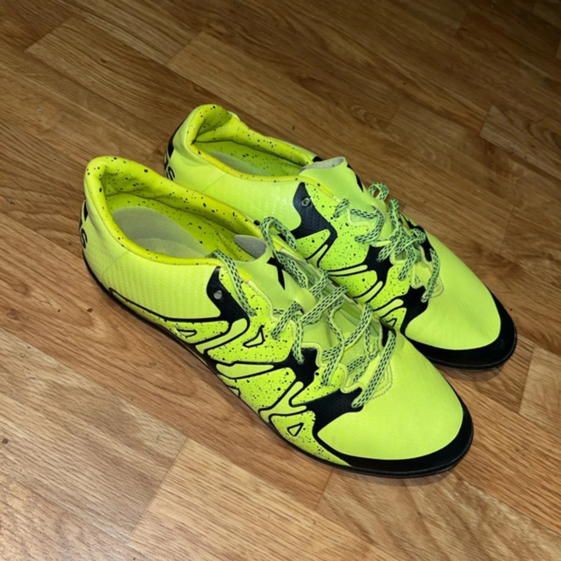 Säljer ett par gula fotbollsskor från Adidas med svarta detaljer och snörning. Skorna har en iögonfallande design och är perfekta för fotbollsplanen. De är märkta med Adidas logotyp på hälen.