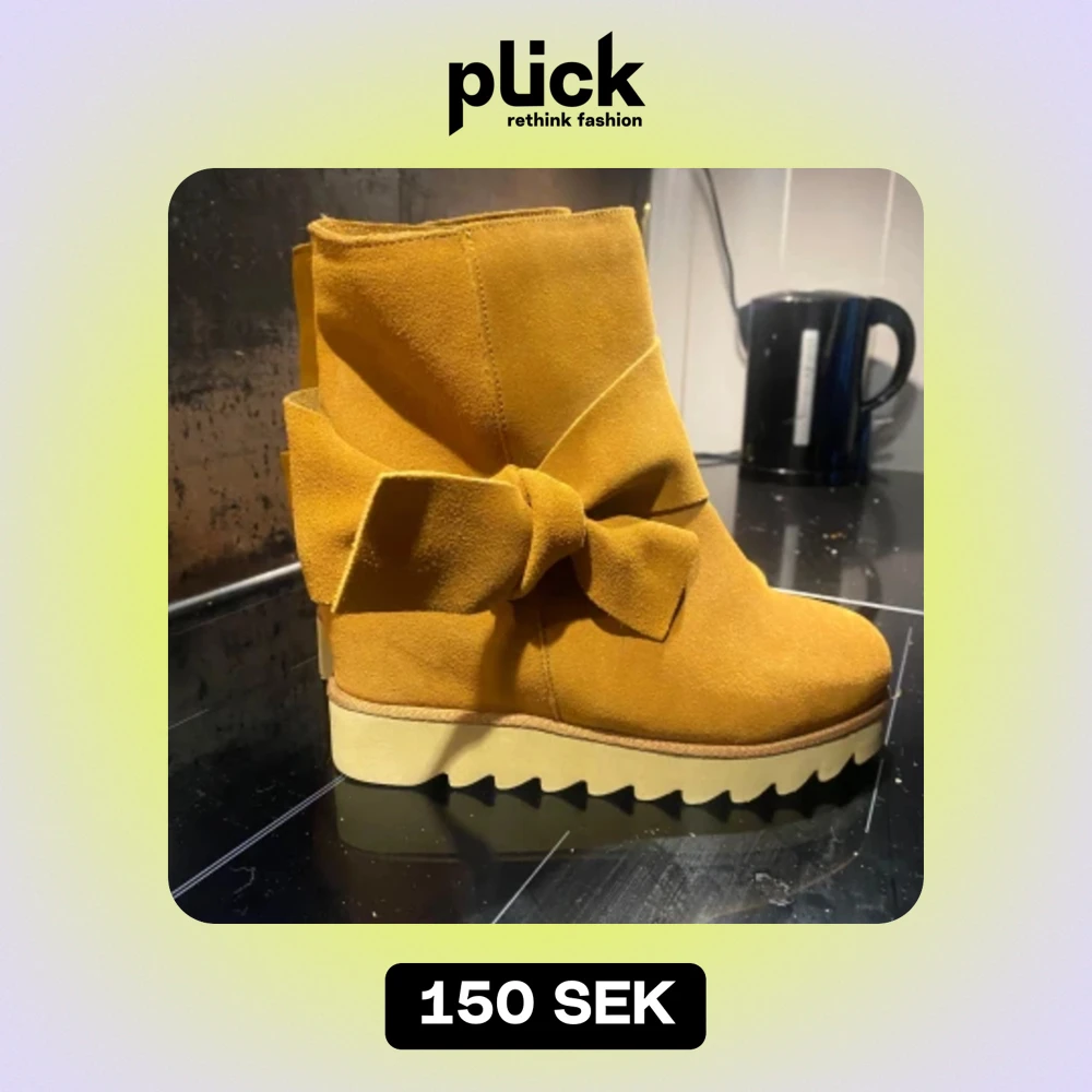 Säljer ett par supercoola bruna mocka boots med en stor rosett på sidan. De har en chunky sula som ger lite extra höjd och stil. Perfekta för höst och vår när du vill sticka ut lite extra. De är i nyskick och redo för nya äventyr!