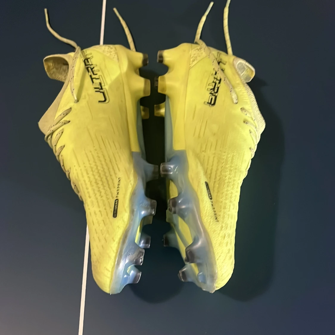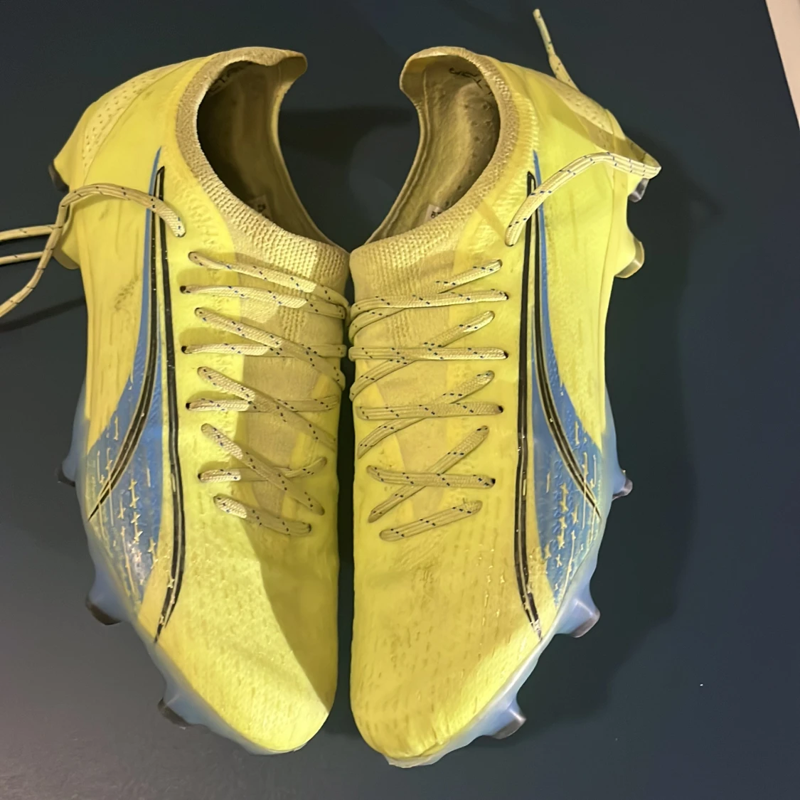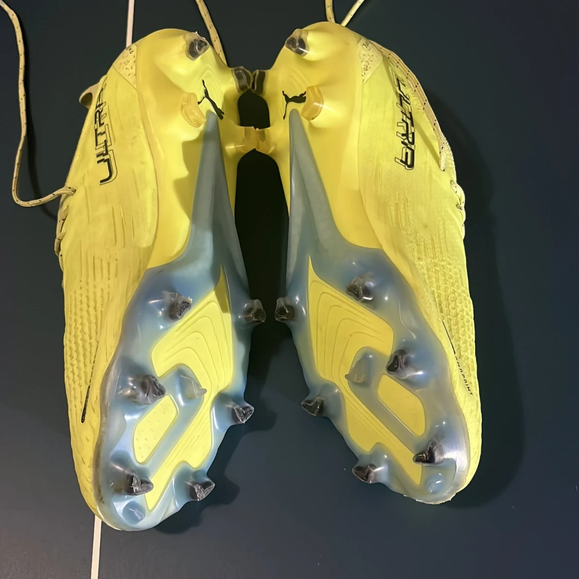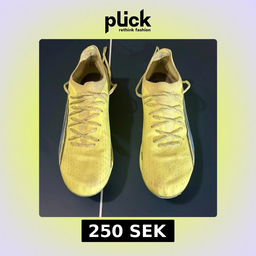 Säljer ett par gula Puma Ultra fotbollsskor med snörning och svart logga på sidan. Skorna har en smal och sportig form, mönstrad ovandel och dobbar i genomskinlig plast för bästa grepp på planen. Lätta och flexibla, perfekta för snabba rörelser.